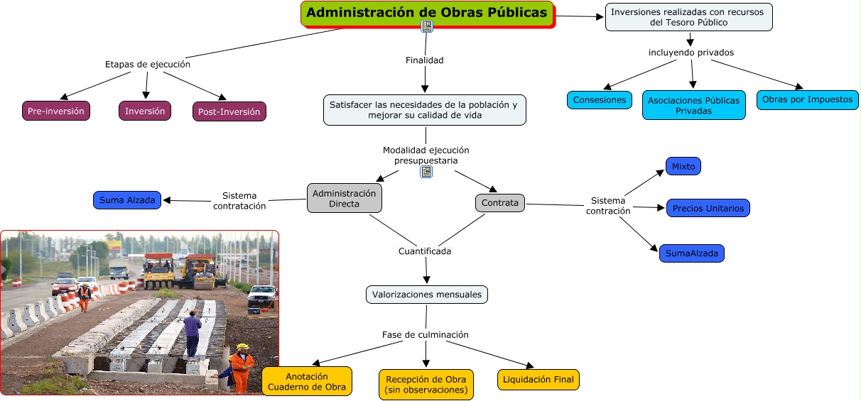 This Concept Map, created with IHMC CmapTools, has information related to: Mapa Conceptual Adm de Obras Públicas, Satisfacer las necesidades de la población y mejorar su calidad de vida Modalidad ejecución presupuestaria Contrata, Administración de Obras Públicas Finalidad Satisfacer las necesidades de la población y mejorar su calidad de vida, Administración de Obras Públicas Etapas de ejecución Pre-inversión, Administración Directa Sistema contratación Suma Alzada, Contrata Sistema contración Mixto, Valorizaciones mensuales Fase de culminación Liquidación Final, Inversiones realizadas con recursos del Tesoro Público incluyendo privados Obras por Impuestos, Contrata Sistema contración SumaAlzada, Administración Directa Cuantificada Valorizaciones mensuales, Contrata Cuantificada Valorizaciones mensuales, Valorizaciones mensuales Fase de culminación Anotación Cuaderno de Obra, Administración de Obras Públicas Etapas de ejecución Inversión, Contrata Sistema contración Precios Unitarios, Administración de Obras Públicas Son Inversiones realizadas con recursos del Tesoro Público, Inversiones realizadas con recursos del Tesoro Público incluyendo privados Consesiones, Valorizaciones mensuales Fase de culminación Recepción de Obra (sin observaciones), Administración de Obras Públicas Etapas de ejecución Post-Inversión, Inversiones realizadas con recursos del Tesoro Público incluyendo privados Asociaciones Públicas Privadas, Satisfacer las necesidades de la población y mejorar su calidad de vida Modalidad ejecución presupuestaria Administración Directa