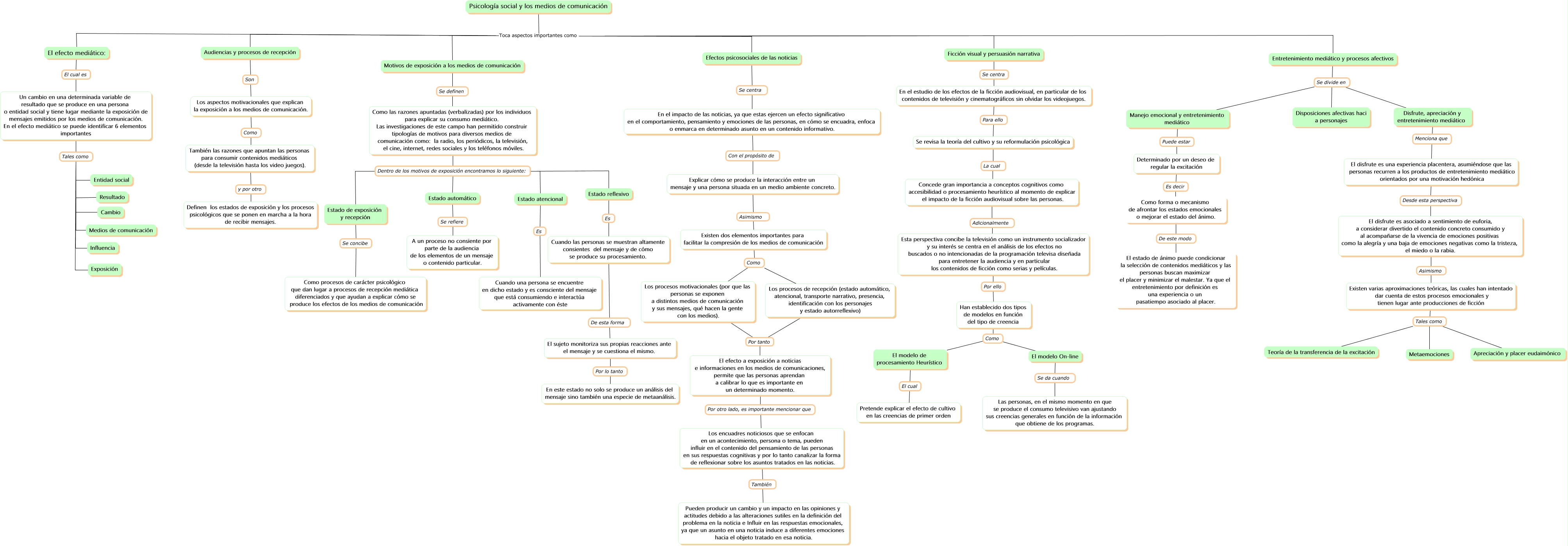 Este Cmap, tiene información relacionada con: Psicología social y los medios de comunicación, Psicología social y los medios de comunicación Toca aspectos importantes como Ficción visual y persuasión narrativa, El disfrute es una experiencia placentera, asumiéndose que las personas recurren a los productos de entretenimiento mediático orientados por una motivación hedónica Desde esta perspectiva El disfrute es asociado a sentimiento de euforia, a considerar divertido el contenido concreto consumido y al acompañarse de la vivencia de emociones positivas como la alegría y una baja de emociones negativas como la tristeza, el miedo o la rabia., Existen dos elementos importantes para facilitar la compresión de los medios de comunicación Como Los procesos de recepción (estado automático, atencional, transporte narrativo, presencia, identificación con los personajes y estado autorreflexivo), Estado reflexivo Es Cuando las personas se muestran altamente consientes del mensaje y de cómo se produce su procesamiento., En el impacto de las noticias, ya que estas ejercen un efecto significativo en el comportamiento, pensamiento y emociones de las personas, en cómo se encuadra, enfoca o enmarca en determinado asunto en un contenido informativo. Con el propósito de Explicar cómo se produce la interacción entre un mensaje y una persona situada en un medio ambiente concreto., Existen varias aproximaciones teóricas, las cuales han intentado dar cuenta de estos procesos emocionales y tienen lugar ante producciones de ficción Tales como Metaemociones, El disfrute es asociado a sentimiento de euforia, a considerar divertido el contenido concreto consumido y al acompañarse de la vivencia de emociones positivas como la alegría y una baja de emociones negativas como la tristeza, el miedo o la rabia. Asimismo Existen varias aproximaciones teóricas, las cuales han intentado dar cuenta de estos procesos emocionales y tienen lugar ante producciones de ficción, El sujeto monitoriza sus propias reacciones ante el mensaje y se cuestiona el mismo. Por lo tanto En este estado no solo se produce un análisis del mensaje sino también una especie de metaanálisis., Psicología social y los medios de comunicación Toca aspectos importantes como Motivos de exposición a los medios de comunicación, Un cambio en una determinada variable de resultado que se produce en una persona o entidad social y tiene lugar mediante la exposición de mensajes emitidos por los medios de comunicación. En el efecto mediático se puede identificar 6 elementos importantes Tales como Entidad social, En el estudio de los efectos de la ficción audiovisual, en particular de los contenidos de televisión y cinematográficos sin olvidar los videojuegos. Para ello Se revisa la teoría del cultivo y su reformulación psicológica, Los procesos de recepción (estado automático, atencional, transporte narrativo, presencia, identificación con los personajes y estado autorreflexivo) Por tanto El efecto a exposición a noticias e informaciones en los medios de comunicaciones, permite que las personas aprendan a calibrar lo que es importante en un determinado momento., Audiencias y procesos de recepción Son Los aspectos motivacionales que explican la exposición a los medios de comunicación., Entretenimiento mediático y procesos afectivos Se divide en Disposiciones afectivas haci a personajes, Los procesos motivacionales (por que las personas se exponen a distintos medios de comunicación y sus mensajes, qué hacen la gente con los medios). Por tanto El efecto a exposición a noticias e informaciones en los medios de comunicaciones, permite que las personas aprendan a calibrar lo que es importante en un determinado momento., Un cambio en una determinada variable de resultado que se produce en una persona o entidad social y tiene lugar mediante la exposición de mensajes emitidos por los medios de comunicación. En el efecto mediático se puede identificar 6 elementos importantes Tales como Exposición, Psicología social y los medios de comunicación Toca aspectos importantes como El efecto mediático:, Estado automático Se refiere A un proceso no consiente por parte de la audiencia de los elementos de un mensaje o contenido particular., Un cambio en una determinada variable de resultado que se produce en una persona o entidad social y tiene lugar mediante la exposición de mensajes emitidos por los medios de comunicación. En el efecto mediático se puede identificar 6 elementos importantes Tales como Resultado, Disfrute, apreciación y entretenimiento mediático Menciona que El disfrute es una experiencia placentera, asumiéndose que las personas recurren a los productos de entretenimiento mediático orientados por una motivación hedónica