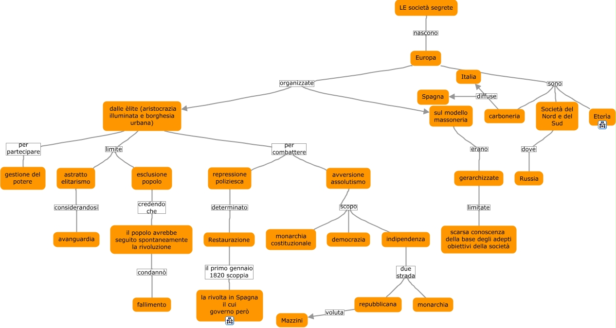 Questa Cmap, creata con IHMC CmapTools, contiene informazioni relative a: LE società segrete, Restaurazione il primo gennaio 1820 scoppia la rivolta in Spagna il cui governo però, dalle èlite (aristocrazia illuminata e borghesia urbana) per combattere avversione assolutismo, il popolo avrebbe seguito spontaneamente la rivoluzione condannò fallimento, indipendenza due strada monarchia, Europa organizzate dalle èlite (aristocrazia illuminata e borghesia urbana), dalle èlite (aristocrazia illuminata e borghesia urbana) limite esclusione popolo, Europa sono Eterìa, dalle èlite (aristocrazia illuminata e borghesia urbana) per combattere repressione poliziesca, dalle èlite (aristocrazia illuminata e borghesia urbana) limite astratto elitarismo, sul modello massoneria erano gerarchizzate, carboneria diffuse Italia, repressione poliziesca determinato Restaurazione, Europa organizzate sul modello massoneria, esclusione popolo credendo che il popolo avrebbe seguito spontaneamente la rivoluzione, avversione assolutismo scopo indipendenza, Europa sono Società del Nord e del Sud, avversione assolutismo scopo monarchia costituzionale, Società del Nord e del Sud dove Russia, astratto elitarismo considerandosi avanguardia, repubblicana voluta Mazzini