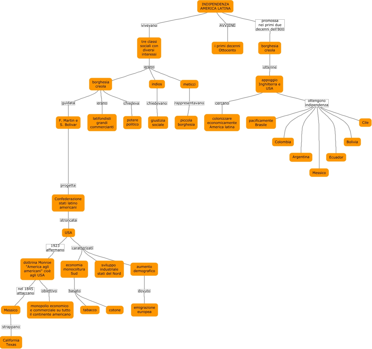 Questa Cmap, creata con IHMC CmapTools, contiene informazioni relative a: INDIPENDENZA AMERICA LATINA, borghesia creola ottenne appoggio Inghilterra e USA, tre classi sociali con diversi interessi erano indios, INDIPENDENZA AMERICA LATINA vivevano tre classi sociali con diversi interessi, dottrina Monroe "America agli americani" cioè agli USA obiettivo monopolio economico e commerciale su tutto il continente americano, borghesia creola erano latifondisti grandi commercianti, economia monocoltura Sud basato cotone, USA caratterizati economia monocoltura Sud, USA caratterizati sviluppo industriale stati del Nord, borghesia creola chiedeva potere politico, Messico strappano California Texas, appoggio Inghilterra e USA cercano colonizzare economicamente America latina, appoggio Inghilterra e USA ottengono indipendenza Ecuador, indios chiedevano giustizia sociale, meticci rappresentavano piccola borghesia, dottrina Monroe "America agli americani" cioè agli USA nel 1845 attaccano Messico, USA caratterizati aumento demografico, Confederazione stati latino americani stroncata USA, appoggio Inghilterra e USA ottengono indipendenza Colombia, INDIPENDENZA AMERICA LATINA AVVIENE i primi decenni Ottocento, economia monocoltura Sud basato tabacco