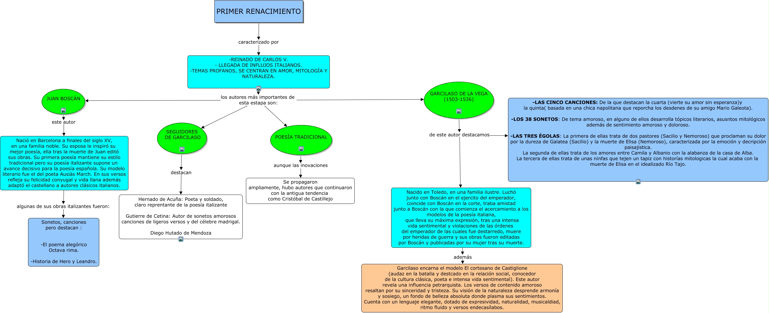 Este Cmap, tiene información relacionada con: ESQUEMA RENACIMIENTO, -REINADO DE CARLOS V. - LLEGADA DE INFLUJOS ITALIANOS. -TEMAS PROFANOS, SE CENTRAN EN AMOR, MITOLOGÍA Y NATURALEZA. los autores más importantes de esta estapa son: JUAN BOSCÁN, GARCILASO DE LA VEGA (1503-1536) de este autor destacamos -LAS CINCO CANCIONES: De la que destacan la cuarta (vierte su amor sin esperanza)y la quinta( basada en una chica napolitana que reporcha los desdenes de su amigo Mario Galeota). -LOS 38 SONETOS: De tema amoroso, en alguno de ellos desarrolla tópicos literarios, asusntos mitológicos además de sentimiento amoroso y doloroso. -LAS TRES ÉGOLAS: La primera de ellas trata de dos pastores (Sacilio y Nemoroso) que proclaman su dolor por la dureza de Galatea (Sacilio) y la muerte de Elisa (Nemoroso), caracterizada por la emoción y decripción paisajistica. La segunda de ellas trata de los amores entre Camila y Albanio con la alabanza de la casa de Alba. La tercera de ellas trata de unas ninfas que tejen un tapiz con historías mitologicas la cual acaba con la muerte de Elisa en el idealizado Río Tajo., JUAN BOSCÁN este autor Nació en Barcelona a finales del siglo XV, en una familia noble. Su esposa le inspiró su mejor poesía, ella tras la muerte de Juan editó sus obras. Su primera poesía mantiene su estilo tradicional pero su poesía italizante supone un avance decisivo para la poesía española. Su modelo literario fue el del poeta Ausiàs March. En sus versos refleja su felicidad conyugal y vida llana además adaptó el castellano a autores clásicos italianos., -REINADO DE CARLOS V. - LLEGADA DE INFLUJOS ITALIANOS. -TEMAS PROFANOS, SE CENTRAN EN AMOR, MITOLOGÍA Y NATURALEZA. los autores más importantes de esta estapa son: POESÍA TRADICIONAL, Nació en Barcelona a finales del siglo XV, en una familia noble. Su esposa le inspiró su mejor poesía, ella tras la muerte de Juan editó sus obras. Su primera poesía mantiene su estilo tradicional pero su poesía italizante supone un avance decisivo para la poesía española. Su modelo literario fue el del poeta Ausiàs March. En sus versos refleja su felicidad conyugal y vida llana además adaptó el castellano a autores clásicos italianos. algunas de sus obras italizantes fueron: Sonetos, canciones pero destacan : -El poema alegórico Octava rima. -Historia de Hero y Leandro., SEGUIDORES DE GARCILASO destacan Hernado de Acuña: Poeta y soldado, claro reprentante de la poesía italizante Gutierre de Cetina: Autor de sonetos amorosos canciones de ligeros versos y del célebre madrigal. Diego Hutado de Mendoza, Nacido en Toledo, en una familia ilustre. Luchó junto con Boscán en el ejercito del emperador, coincide con Boscán en la corte, traba amistad junto a Boscán con la que comienza el acercamiento a los modelos de la poesía italiana, que lleva su máxima expresión, tras una intensa vida sentimental y violaciones de las órdenes del emperador de las cuales fue destarredo, muere por heridas de guerra y sus obras fueron editadas por Boscán y publicadas por su mujer tras su muerte. además Garcilaso encarna el modelo El cortesano de Castiglione (audaz en la batalla y destcado en la relación social, conocedor de la cultura clásica, poeta e intensa vida sentimental). Este autor revela una influencia petrarquista. Los versos de contenido amoroso resaltan por su sinceridad y tristeza. Su visión de la naturaleza desprende armonía y sosiego, un fondo de belleza absoluta donde plasma sus sentimientos. Cuenta con un lenguaje elegante, dotado de expresividad, naturalidad, musicaldiad, ritmo fluido y versos endecasílabos., POESÍA TRADICIONAL aunque las inovaciones Se propagaron ampliamente, hubo autores que continuaron con la antigua tendencia como Cristóbal de Castillejo, GARCILASO DE LA VEGA (1503-1536) de este autor destacamos Nacido en Toledo, en una familia ilustre. Luchó junto con Boscán en el ejercito del emperador, coincide con Boscán en la corte, traba amistad junto a Boscán con la que comienza el acercamiento a los modelos de la poesía italiana, que lleva su máxima expresión, tras una intensa vida sentimental y violaciones de las órdenes del emperador de las cuales fue destarredo, muere por heridas de guerra y sus obras fueron editadas por Boscán y publicadas por su mujer tras su muerte., -REINADO DE CARLOS V. - LLEGADA DE INFLUJOS ITALIANOS. -TEMAS PROFANOS, SE CENTRAN EN AMOR, MITOLOGÍA Y NATURALEZA. los autores más importantes de esta estapa son: SEGUIDORES DE GARCILASO, -REINADO DE CARLOS V. - LLEGADA DE INFLUJOS ITALIANOS. -TEMAS PROFANOS, SE CENTRAN EN AMOR, MITOLOGÍA Y NATURALEZA. los autores más importantes de esta estapa son: GARCILASO DE LA VEGA (1503-1536), PRIMER RENACIMIENTO caracterizado por -REINADO DE CARLOS V. - LLEGADA DE INFLUJOS ITALIANOS. -TEMAS PROFANOS, SE CENTRAN EN AMOR, MITOLOGÍA Y NATURALEZA.
