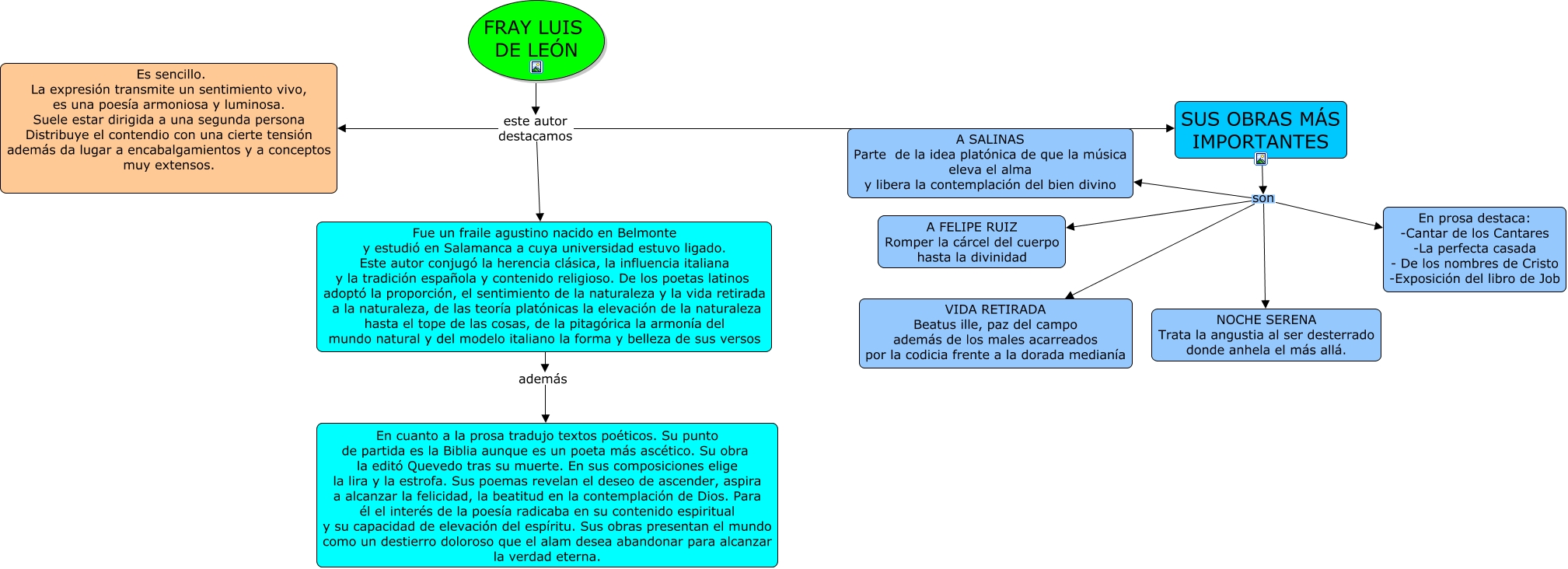 Este Cmap, tiene información relacionada con: Fray Luis de León, SUS OBRAS MÁS IMPORTANTES son A FELIPE RUIZ Romper la cárcel del cuerpo hasta la divinidad, SUS OBRAS MÁS IMPORTANTES son VIDA RETIRADA Beatus ille, paz del campo además de los males acarreados por la codicia frente a la dorada medianía, FRAY LUIS DE LEÓN este autor destacamos SUS OBRAS MÁS IMPORTANTES, SUS OBRAS MÁS IMPORTANTES son NOCHE SERENA Trata la angustia al ser desterrado donde anhela el más allá., FRAY LUIS DE LEÓN este autor destacamos Fue un fraile agustino nacido en Belmonte y estudió en Salamanca a cuya universidad estuvo ligado. Este autor conjugó la herencia clásica, la influencia italiana y la tradición española y contenido religioso. De los poetas latinos adoptó la proporción, el sentimiento de la naturaleza y la vida retirada a la naturaleza, de las teoría platónicas la elevación de la naturaleza hasta el tope de las cosas, de la pitagórica la armonía del mundo natural y del modelo italiano la forma y belleza de sus versos, SUS OBRAS MÁS IMPORTANTES son En prosa destaca: -Cantar de los Cantares -La perfecta casada - De los nombres de Cristo -Exposición del libro de Job, SUS OBRAS MÁS IMPORTANTES son A SALINAS Parte de la idea platónica de que la música eleva el alma y libera la contemplación del bien divino, FRAY LUIS DE LEÓN este autor destacamos Es sencillo. La expresión transmite un sentimiento vivo, es una poesía armoniosa y luminosa. Suele estar dirigida a una segunda persona Distribuye el contendio con una cierte tensión además da lugar a encabalgamientos y a conceptos muy extensos., Fue un fraile agustino nacido en Belmonte y estudió en Salamanca a cuya universidad estuvo ligado. Este autor conjugó la herencia clásica, la influencia italiana y la tradición española y contenido religioso. De los poetas latinos adoptó la proporción, el sentimiento de la naturaleza y la vida retirada a la naturaleza, de las teoría platónicas la elevación de la naturaleza hasta el tope de las cosas, de la pitagórica la armonía del mundo natural y del modelo italiano la forma y belleza de sus versos además En cuanto a la prosa tradujo textos poéticos. Su punto de partida es la Biblia aunque es un poeta más ascético. Su obra la editó Quevedo tras su muerte. En sus composiciones elige la lira y la estrofa. Sus poemas revelan el deseo de ascender, aspira a alcanzar la felicidad, la beatitud en la contemplación de Dios. Para él el interés de la poesía radicaba en su contenido espiritual y su capacidad de elevación del espíritu. Sus obras presentan el mundo como un destierro doloroso que el alam desea abandonar para alcanzar la verdad eterna.