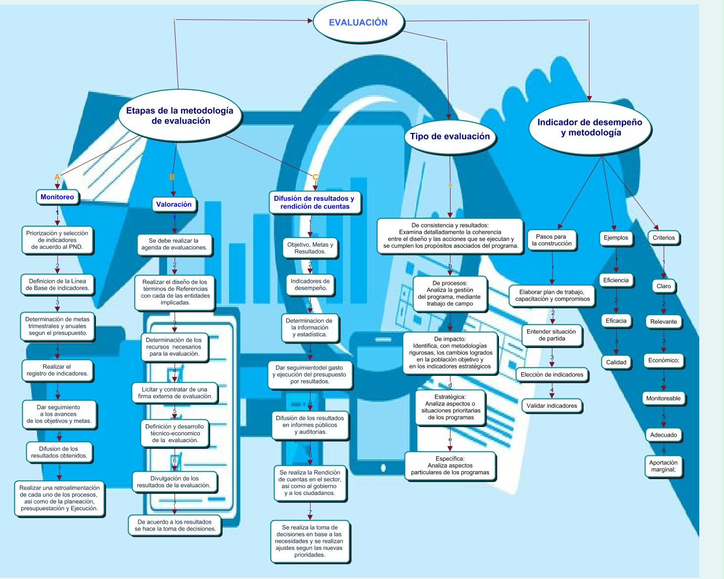 Este Cmap, tiene información relacionada con: etapas de la metodología de evaluación SARAI TADDEI, De procesos: Analiza la gestión del programa, mediante trabajo de campo c De impacto: Identifica, con metodologías rigurosas, los cambios logrados en la población objetivo y en los indicadores estratégicos, EVALUACIÓN . Tipo de evaluación, Se realiza la Rendición de cuentas en el sector, asi como al gobierno y a los ciudadanos. 7 Se realiza la toma de decisiones en base a las necesidades y se realizan ajustes segun las nuevas prioridades., Realizar el registro de indicadores. 5 Dar seguimiento a los avances de los objetivos y metas., Etapas de la metodología de evaluación . EVALUACIÓN, Indicador de desempeño y metodología . Criterios, Indicador de desempeño y metodología . Pasos para la construcción, Difusion de los resultados obtenidos. 7 Realizar una retroalimentación de cada uno de los procesos, asi como de la planeación, presupuestación y Ejecución., Claro 2 Relevante, Indicador de desempeño y metodología . Ejemplos, Eficacia 3 Calidad, Entender situación de partida 3 Elección de indicadores, Realizar el diseño de los términos de Referencias con cada de las entidades implicadas. 3 Determinación de los recursos necesarios para la evaluación., De consistencia y resultados: Examina detalladamente la coherencia entre el diseño y las acciones que se ejecutan y se cumplen los propósitos asociados del programa. b De procesos: Analiza la gestión del programa, mediante trabajo de campo, Elección de indicadores 4 Validar indicadores, Etapas de la metodología de evaluación C Difusión de resultados y rendición de cuentas, Tipo de evaluación a De consistencia y resultados: Examina detalladamente la coherencia entre el diseño y las acciones que se ejecutan y se cumplen los propósitos asociados del programa., Pasos para la construcción 1 Elaborar plan de trabajo, capacitación y compromisos, Determinación de metas trimestrales y anuales segun el presupuesto. 4 Realizar el registro de indicadores., Objetivo, Metas y Resultados. 2 Indicadores de desempeño.