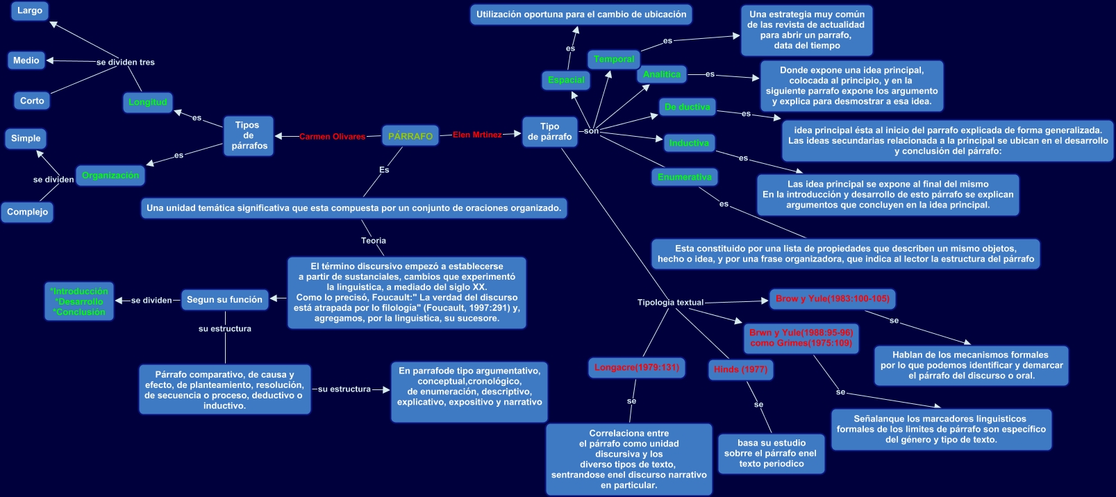 Este Cmap, tiene información relacionada con: MAPA2, Segun su función su estructura Párrafo comparativo, de causa y efecto, de planteamiento, resolución, de secuencia o proceso, deductivo o inductivo., Brwn y Yule(1988:95-96) como Grimes(1975:109) se Señalanque los marcadores linguisticos formales de los limites de párrafo son específico del género y tipo de texto., Tipo de párrafo son Analitica, Organización se dividen dos Simple, Tipo de párrafo son Inductiva, Tipo de párrafo son De ductiva, Longacre(1979:131) se Correlaciona entre el párrafo como unidad discursiva y los diverso tipos de texto, sentrandose enel discurso narrativo en particular., Párrafo comparativo, de causa y efecto, de planteamiento, resolución, de secuencia o proceso, deductivo o inductivo. su estructura En parrafode tipo argumentativo, conceptual,cronológico, de enumeración, descriptivo, explicativo, expositivo y narrativo, Longitud se dividen tres Largo, Tipo de párrafo Tipologia textual Brwn y Yule(1988:95-96) como Grimes(1975:109), Longitud se dividen tres Corto, Tipo de párrafo son Enumerativa, PÁRRAFO Elen Mrtinez Tipo de párrafo, Tipo de párrafo son Espacial, Tipo de párrafo son Temporal, Segun su función se dividen *Introducción *Desarrollo *Conclusión, De ductiva es idea principal ésta al inicio del parrafo explicada de forma generalizada. Las ideas secundarias relacionada a la principal se ubican en el desarrollo y conclusión del párrafo:, Tipos de párrafos es Longitud, Inductiva es Las idea principal se expone al final del mismo En la introducción y desarrollo de esto párrafo se explican argumentos que concluyen en la idea principal., Una unidad temática significativa que esta compuesta por un conjunto de oraciones organizado. Teoria El término discursivo empezó a establecerse a partir de sustanciales, cambios que experimentó la linguistica, a mediado del siglo XX. Como lo precisó, Foucault:" La verdad del discurso está atrapada por lo filología" (Foucault, 1997:291) y, agregamos, por la linguistica, su sucesore.