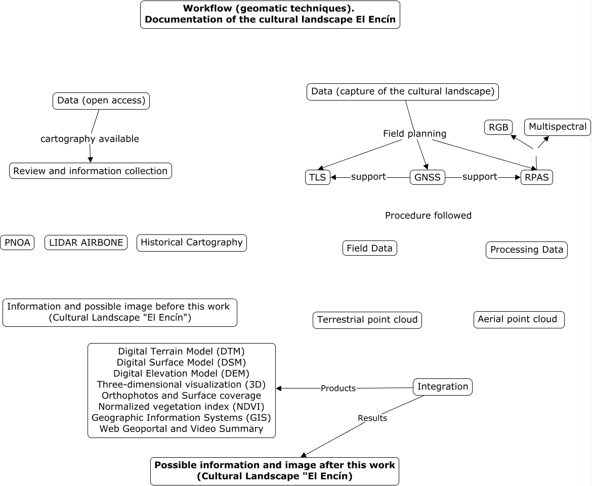 Este Cmap, tiene información relacionada con: El Encin 20 junio, Integration Products Digital Terrain Model (DTM) Digital Surface Model (DSM) Digital Elevation Model (DEM) Three-dimensional visualization (3D) Orthophotos and Surface coverage Normalized vegetation index (NDVI) Geographic Information Systems (GIS) Web Geoportal and Video Summary, RPAS RGB, GNSS support TLS, Data (capture of the cultural landscape) Field planning GNSS, RPAS Multispectral, GNSS support RPAS, Data (capture of the cultural landscape) Field planning RPAS, Data (capture of the cultural landscape) Field planning TLS, Integration Results Possible information and image after this work (Cultural Landscape "El Encín), Data (open access) Review and information collection