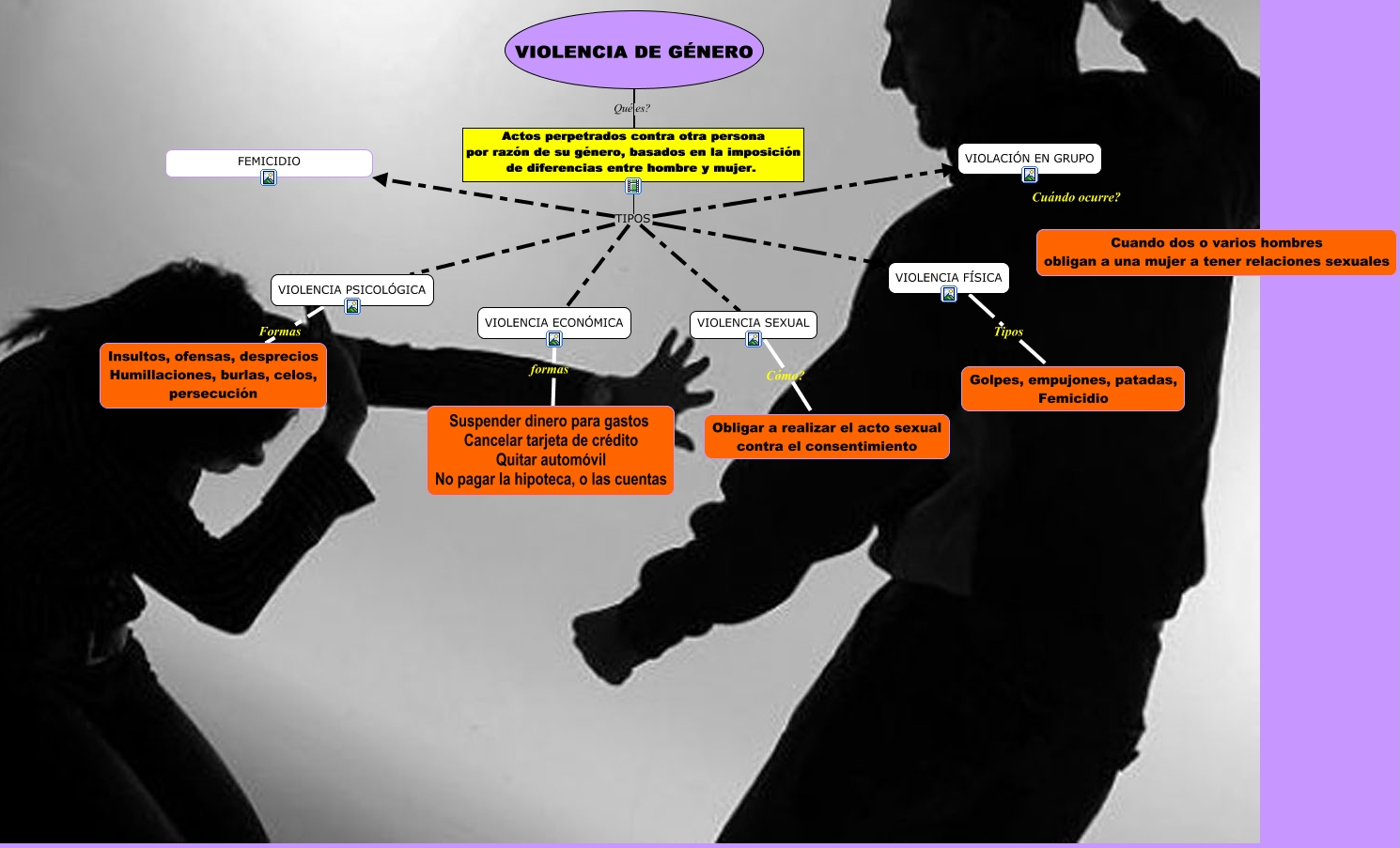 Este Cmap, tiene información relacionada con: VIOLENCIA DE GENERO 1, VIOLENCIA DE GÉNERO TIPOS VIOLENCIA PSICOLÓGICA, VIOLENCIA SEXUAL Cómo? Obligar a realizar el acto sexual contra el consentimiento, VIOLENCIA PSICOLÓGICA Formas Insultos, ofensas, desprecios Humillaciones, burlas, celos, persecución, VIOLENCIA DE GÉNERO TIPOS VIOLENCIA SEXUAL, VIOLENCIA ECONÓMICA formas Suspender dinero para gastos Cancelar tarjeta de crédito Quitar automóvil No pagar la hipoteca, o las cuentas, VIOLENCIA DE GÉNERO Qué es? Actos perpetrados contra otra persona por razón de su género, basados en la imposición de diferencias entre hombre y mujer., VIOLENCIA DE GÉNERO TIPOS VIOLENCIA ECONÓMICA, VIOLENCIA FÍSICA Tipos Golpes, empujones, patadas, Femicidio, VIOLENCIA DE GÉNERO TIPOS VIOLACIÓN EN GRUPO, VIOLACIÓN EN GRUPO Cuándo ocurre? Cuando dos o varios hombres obligan a una mujer a tener relaciones sexuales, VIOLENCIA DE GÉNERO TIPOS VIOLENCIA FÍSICA, VIOLENCIA DE GÉNERO TIPOS FEMICIDIO