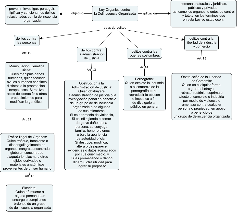 Este Cmap, tiene información relacionada con: legislacion penal especial.cmap OK, Ley Órganica contra la Delincuencia Organizada tipos de delitos delitos contra la administracíon de justicia, delitos contra las personas Art 10 Manipulación Genética ilícita: Quien manipule genes humanos, quien fecunde óvulos humanos con fines distintos a la procreación, terapeuticos. Si realiza actos de clonación u otros prodecimientos para modificar la genética., Ley Órganica contra la Delincuencia Organizada tipos de delitos delitos contra las buenas costumbres, delitos contra las buenas costumbres Art14 Pornografia: Quien explote la industria o el comercio de la pornografía para reproducir lo obscen o impúdico a fin de divulgarlo al público en general, Ley Órganica contra la Delincuencia Organizada objetivo prevenir, investigar, perseguir, tipificar y sancionar los delitos relacionados con la delincuencia organizada., Ley Órganica contra la Delincuencia Organizada tipos de delitos delitos contra las personas, Tráfico ilegal de Organos: Quien trafique, trasplante o dispongailegalmente de órganos, sangre,concentrado globular, concentrado plaquetario, plasma u otros tejidos derivados o materiales anatómicos provenientes de un ser humano. Art 12 Sicariato: Quien dé muerte a alguna persona por encargo o cumpliendo órdenes de un grupo de delincuencia organizada, Ley Órganica contra la Delincuencia Organizada aplicación personas naturales y jurídicas, públicas y privadas, así como los órganos o entes de control y tutela en los términos que en esta Ley se establecen., Manipulación Genética ilícita: Quien manipule genes humanos, quien fecunde óvulos humanos con fines distintos a la procreación, terapeuticos. Si realiza actos de clonación u otros prodecimientos para modificar la genética. Art 11 Tráfico ilegal de Organos: Quien trafique, trasplante o dispongailegalmente de órganos, sangre,concentrado globular, concentrado plaquetario, plasma u otros tejidos derivados o materiales anatómicos provenientes de un ser humano., delitos contra la administracíon de justicia Art 13 Obstrucción a la Administración de Justicia: Quien obstruyere la administración de justicia o la investigación penal en beneficio de un grupo de delincuencia organizada o de algunos de sus miembros. Si es por medio de violencia, Si es inflingiendo el temor de grave daño a una persona, su cónyuge, familia, honor o bienes o bajo la apariencia de autoridad oficial, Si destruye, modifica, altera o desaparece evidencias o datos acumulados por cualquier medio, y Si es prometiendo o dando dinero u otra utilidad para lograr su propósito, Ley Órganica contra la Delincuencia Organizada tipos de delitos delitos contra la libertad de industria y comercio, delitos contra la libertad de industria y comercio Art 15 Obstrucción de la Libertad de Comercio: Quien en cualquier forma o grado obstruya, retrase, restrinja, suprima o afecte el comercio o industria por medio de violencia o amenaza contra cualquier persona o propiedad, en apoyo o beneficio de un grupo de delincuencia organizada