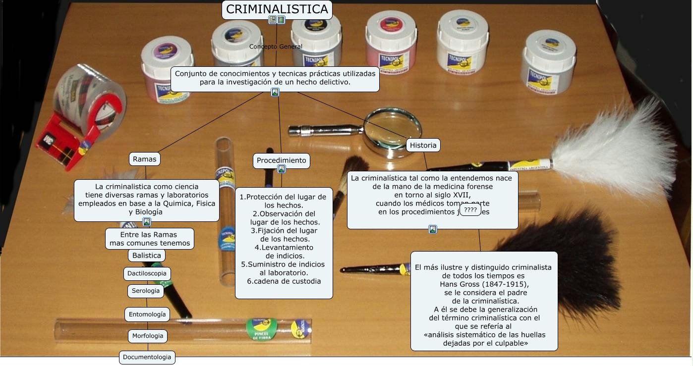 Este Cmap, tiene información relacionada con: Copia de Copia de CRIMINALISTICA_, Conjunto de conocimientos y tecnicas prácticas utilizadas para la investigación de un hecho delictivo. ???? Ramas, La criminalística tal como la entendemos nace de la mano de la medicina forense en torno al siglo XVII, cuando los médicos toman parte en los procedimientos judiciales ???? ????, Ramas ???? La criminalistica como ciencia tiene diversas ramas y laboratorios empleados en base a la Quimica, Fisica y Biología, Conjunto de conocimientos y tecnicas prácticas utilizadas para la investigación de un hecho delictivo. ???? Historia, Historia ???? La criminalística tal como la entendemos nace de la mano de la medicina forense en torno al siglo XVII, cuando los médicos toman parte en los procedimientos judiciales, Entomología ???? Morfologia, Balistica ???? Dactiloscopia, Conjunto de conocimientos y tecnicas prácticas utilizadas para la investigación de un hecho delictivo. ???? Procedimiento, ???? ???? El más ilustre y distinguido criminalista de todos los tiempos es Hans Gross (1847-1915), se le considera el padre de la criminalística. A él se debe la generalización del término criminalística con el que se refería al «análisis sistemático de las huellas dejadas por el culpable», CRIMINALISTICA Concepto General Conjunto de conocimientos y tecnicas prácticas utilizadas para la investigación de un hecho delictivo., Procedimiento ???? 1.Protección del lugar de los hechos. 2.Observación del lugar de los hechos. 3.Fijación del lugar de los hechos. 4.Levantamiento de indicios. 5.Suministro de indicios al laboratorio. 6.cadena de custodia, La criminalistica como ciencia tiene diversas ramas y laboratorios empleados en base a la Quimica, Fisica y Biología ???? Entre las Ramas mas comunes tenemos, Entre las Ramas mas comunes tenemos ???? Balistica, Dactiloscopia ???? Serologia, Serologia ???? Entomología, Morfologia ???? Documentologia