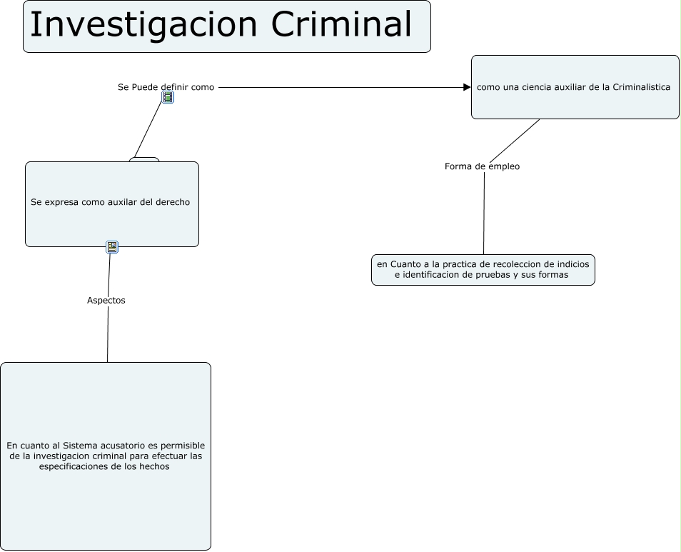 Este Cmap, tiene información relacionada con: investigacion criminal, Se expresa como auxilar del derecho Aspectos En cuanto al Sistema acusatorio es permisible de la investigacion criminal para efectuar las especificaciones de los hechos, Se expresa como auxilar del derecho Se Puede definir como como una ciencia auxiliar de la Criminalistica, como una ciencia auxiliar de la Criminalistica Forma de empleo en Cuanto a la practica de recoleccion de indicios e identificacion de pruebas y sus formas