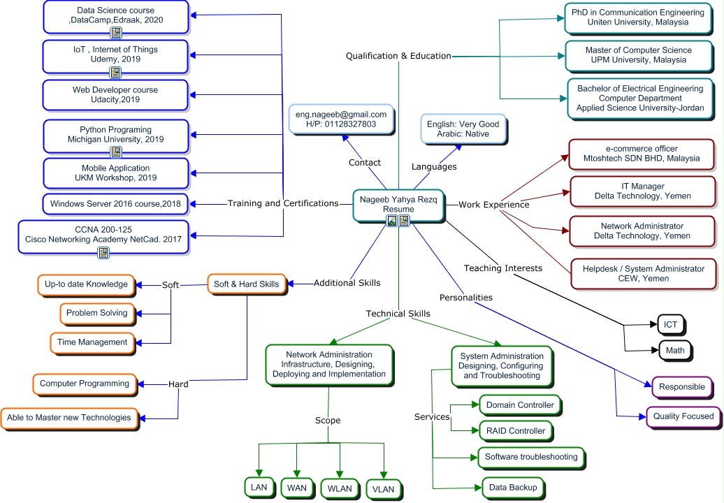 This Concept Map, created with IHMC CmapTools, has information related to: Nageeb Resume, Nageeb Yahya Rezq Resume Qualification & Education Bachelor of Electrical Engineering Computer Department Applied Science University-Jordan, Soft & Hard Skills Soft Up-to date Knowledge, Nageeb Yahya Rezq Resume Technical Skills System Administration Designing, Configuring and Troubleshooting, Nageeb Yahya Rezq Resume Languages English: Very Good Arabic: Native, Nageeb Yahya Rezq Resume Work Experience IT Manager Delta Technology, Yemen, System Administration Designing, Configuring and Troubleshooting Services Data Backup, Soft & Hard Skills Hard Computer Programming, Nageeb Yahya Rezq Resume Training and Certifications Web Developer course Udacity,2019, Soft & Hard Skills Soft Time Management, Nageeb Yahya Rezq Resume Personalities Responsible, Nageeb Yahya Rezq Resume Work Experience e-commerce officer Mtoshtech SDN BHD, Malaysia, Network Administration Infrastructure, Designing, Deploying and Implementation Scope WLAN, Nageeb Yahya Rezq Resume Additional Skills Soft & Hard Skills, Soft & Hard Skills Hard Able to Master new Technologies, Nageeb Yahya Rezq Resume Teaching Interests ICT, Network Administration Infrastructure, Designing, Deploying and Implementation Scope WAN, Nageeb Yahya Rezq Resume Technical Skills Network Administration Infrastructure, Designing, Deploying and Implementation, Nageeb Yahya Rezq Resume Contact eng.nageeb@gmail.com H/P: 01128327803, Soft & Hard Skills Soft Problem Solving, Nageeb Yahya Rezq Resume Work Experience Network Administrator Delta Technology, Yemen