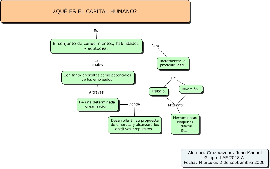 Este Cmap, tiene información relacionada con: Subtema 1.1 CRUZ VAZQUEZ JUAN MANUEL LAE 2018 A, Incrementar la prodcutividad. De Trabajo., Inversión. Mediante Herramientas Máquinas Edificos Etc., De una determinada organización. Donde Desarrollarán su propuesta de empresa y alcanzará los obejtivos propuestos., ¿QUÉ ES EL CAPITAL HUMANO? Es El conjunto de conocimientos, habilidades y actitudes., Son tanto presentes como potenciales de los empleados. A traves De una determinada organización., Incrementar la prodcutividad. De Inversión., El conjunto de conocimientos, habilidades y actitudes. Para Incrementar la prodcutividad., El conjunto de conocimientos, habilidades y actitudes. Las cuales Son tanto presentes como potenciales de los empleados., Trabajo. Mediante Herramientas Máquinas Edificos Etc.