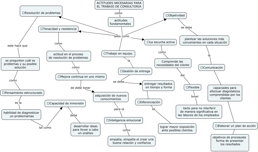 Este Cmap, tiene información relacionada con: 1.1.2 actividades necesarias para el trabajo de consultor, Gestión de entrega se debe entregar resultados en tiempo y forma, La escucha activa como Comprende las necesidades del cliente, Comprende las necesidades del cliente ser Flexible, adquisición de nuevos conocimientos para la Inteligencia emocional, actitudes fundamentales tales como La escucha activa, Capacidad de inmersión debe desarrollar ideas para llevar a cabo un análisis, Mejora continua en uno mismo de debe tener adquisición de nuevos conocimientos, Objetividad se debe plantear las soluciones más convenientes en cada situación, Elaborar un plan de acción ???? objetivos de procesosla forma de presentar los resultados, Inteligencia emocional como empatía, simpatía el crear una buena relación y confianza, se pregunten cuál es problemas y su posible solución como Pensamiento estructurado, actitudes fundamentales tales como Resolución de problemas, capaciades para efectuar diagnósticos comprendidas por los clientes ???? Elaborar un plan de acción, Resolución de problemas este hace que se pregunten cuál es problemas y su posible solución, Comunicación ???? capaciades para efectuar diagnósticos comprendidas por los clientes, Flexible tener tacto para no interferir de manera significativa en las labores de los empleados, Pensamiento estructurado es la habilidad de diagnosticar un problemamas, actitud en el proceso de resolución de problemas como Mejora continua en uno mismo, actitudes fundamentales tales como Objetividad, Tenacidad y resistencia como actitud en el proceso de resolución de problemas