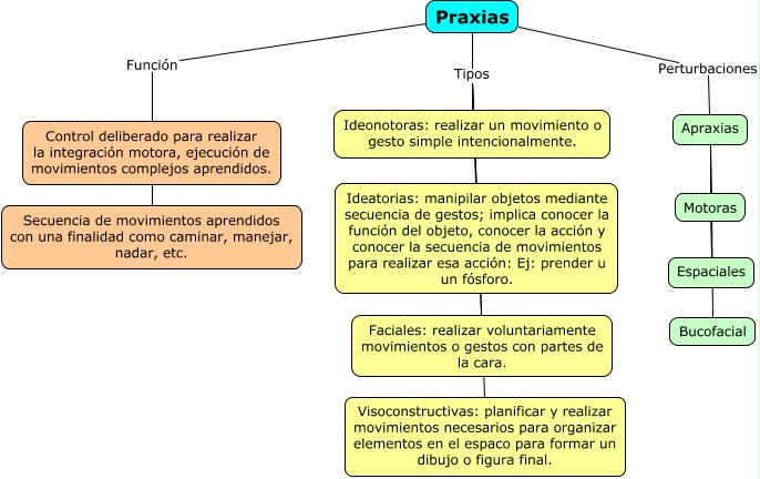Este Cmap, tiene información relacionada con: Neurología Praxias, Apraxias ???? Motoras, Apraxias ???? Espaciales, Praxias Función Control deliberado para realizar la integración motora, ejecución de movimientos complejos aprendidos., Praxias Tipos Faciales: realizar voluntariamente movimientos o gestos con partes de la cara., Praxias Tipos Ideonotoras: realizar un movimiento o gesto simple intencionalmente., Praxias Perturbaciones Apraxias, Praxias Tipos Ideatorias: manipilar objetos mediante secuencia de gestos; implica conocer la función del objeto, conocer la acción y conocer la secuencia de movimientos para realizar esa acción: Ej: prender u un fósforo., Praxias Función Secuencia de movimientos aprendidos con una finalidad como caminar, manejar, nadar, etc., Apraxias ???? Bucofacial, Praxias Tipos Visoconstructivas: planificar y realizar movimientos necesarios para organizar elementos en el espaco para formar un dibujo o figura final.