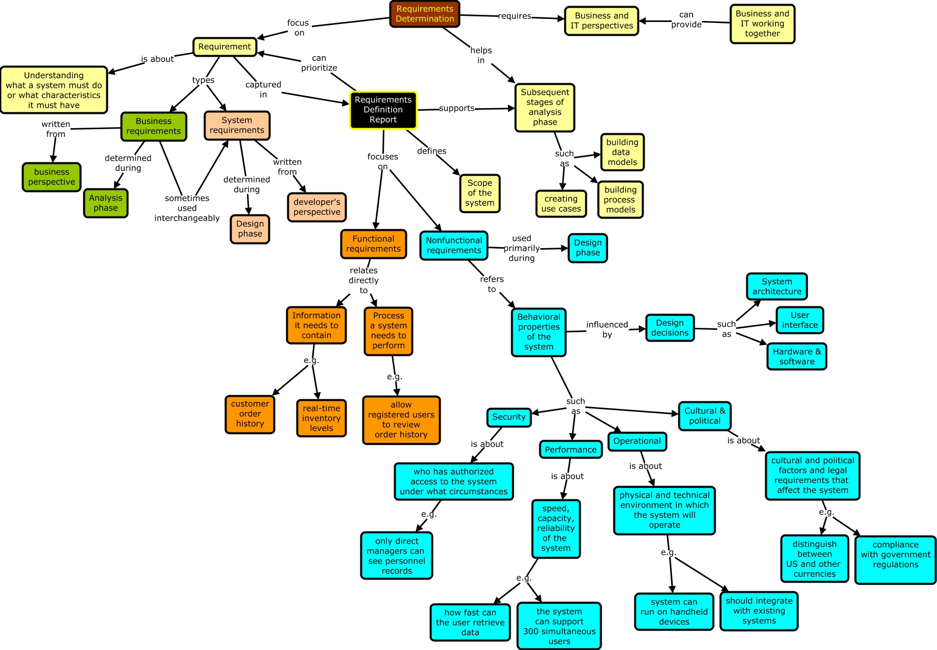This Concept Map, created with IHMC CmapTools, has information related to: Requirements Determination, Requirements Definition Report focuses on Functional requirements, Subsequent stages of analysis phase such as creating use cases, cultural and political factors and legal requirements that affect the system e.g. distinguish between US and other currencies, Functional requirements relates directly to Process a system needs to perform, physical and technical environment in which the system will operate e.g. system can run on handheld devices, Business requirements written from business perspective, Subsequent stages of analysis phase such as building data models, Requirement types Business requirements, Behavioral properties of the system such as Cultural & political, speed, capacity, reliability of the system e.g. how fast can the user retrieve data, who has authorized access to the system under what circumstances e.g. only direct managers can see personnel records, Subsequent stages of analysis phase such as building process models, Design decisions such as Hardware & software, Business requirements determined during Analysis phase, Requirements Definition Report supports Subsequent stages of analysis phase, Requirements Definition Report focuses on Nonfunctional requirements, Business requirements sometimes used interchangeably System requirements, Behavioral properties of the system such as Security, Requirements Determination requires Business and IT perspectives, Information it needs to contain e.g. customer order history