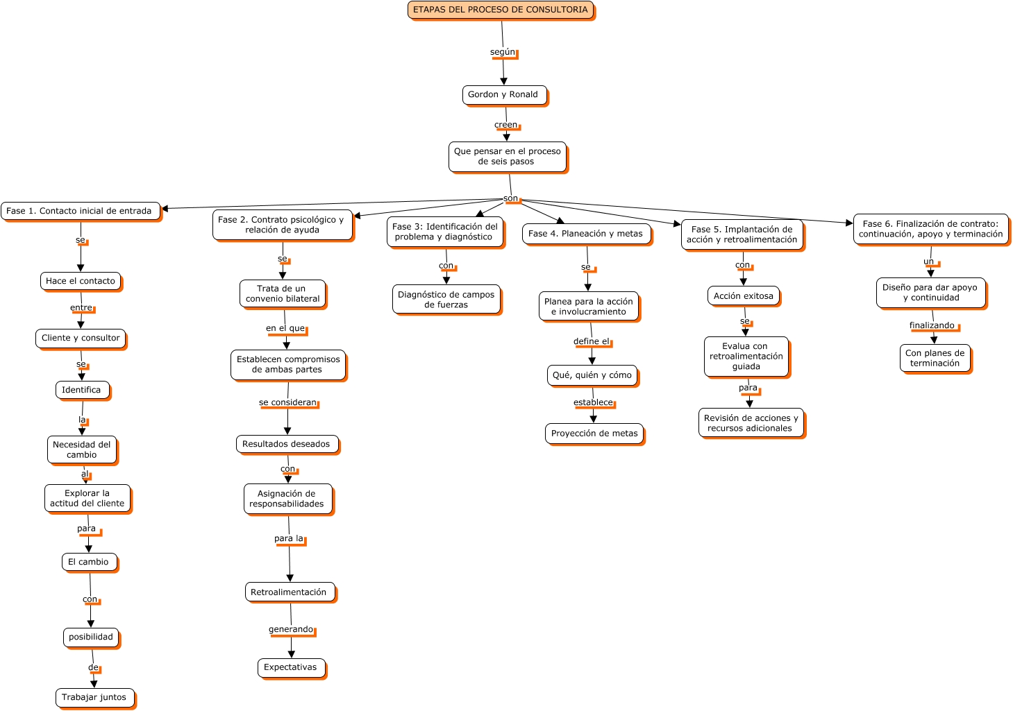 Este Cmap, tiene información relacionada con: ETAPAS DEL PROCESO DE CONSULTORIA, Establecen compromisos de ambas partes se consideran Resultados deseados, Que pensar en el proceso de seis pasos son Fase 5. Implantación de acción y retroalimentación, Planea para la acción e involucramiento define el Qué, quién y cómo, Gordon y Ronald creen Que pensar en el proceso de seis pasos, ETAPAS DEL PROCESO DE CONSULTORIA según Gordon y Ronald, Fase 4. Planeación y metas se Planea para la acción e involucramiento, posibilidad de Trabajar juntos, Retroalimentación generando Expectativas, Fase 2. Contrato psicológico y relación de ayuda se Trata de un convenio bilateral, Acción exitosa se Evalua con retroalimentación guiada, Resultados deseados con Asignación de responsabilidades, Qué, quién y cómo establece Proyección de metas, Diseño para dar apoyo y continuidad finalizando Con planes de terminación, El cambio con posibilidad, Hace el contacto entre Cliente y consultor, Que pensar en el proceso de seis pasos son Fase 1. Contacto inicial de entrada, Fase 1. Contacto inicial de entrada se Hace el contacto, Que pensar en el proceso de seis pasos son Fase 2. Contrato psicológico y relación de ayuda, Que pensar en el proceso de seis pasos son Fase 6. Finalización de contrato: continuación, apoyo y terminación, Evalua con retroalimentación guiada para Revisión de acciones y recursos adicionales