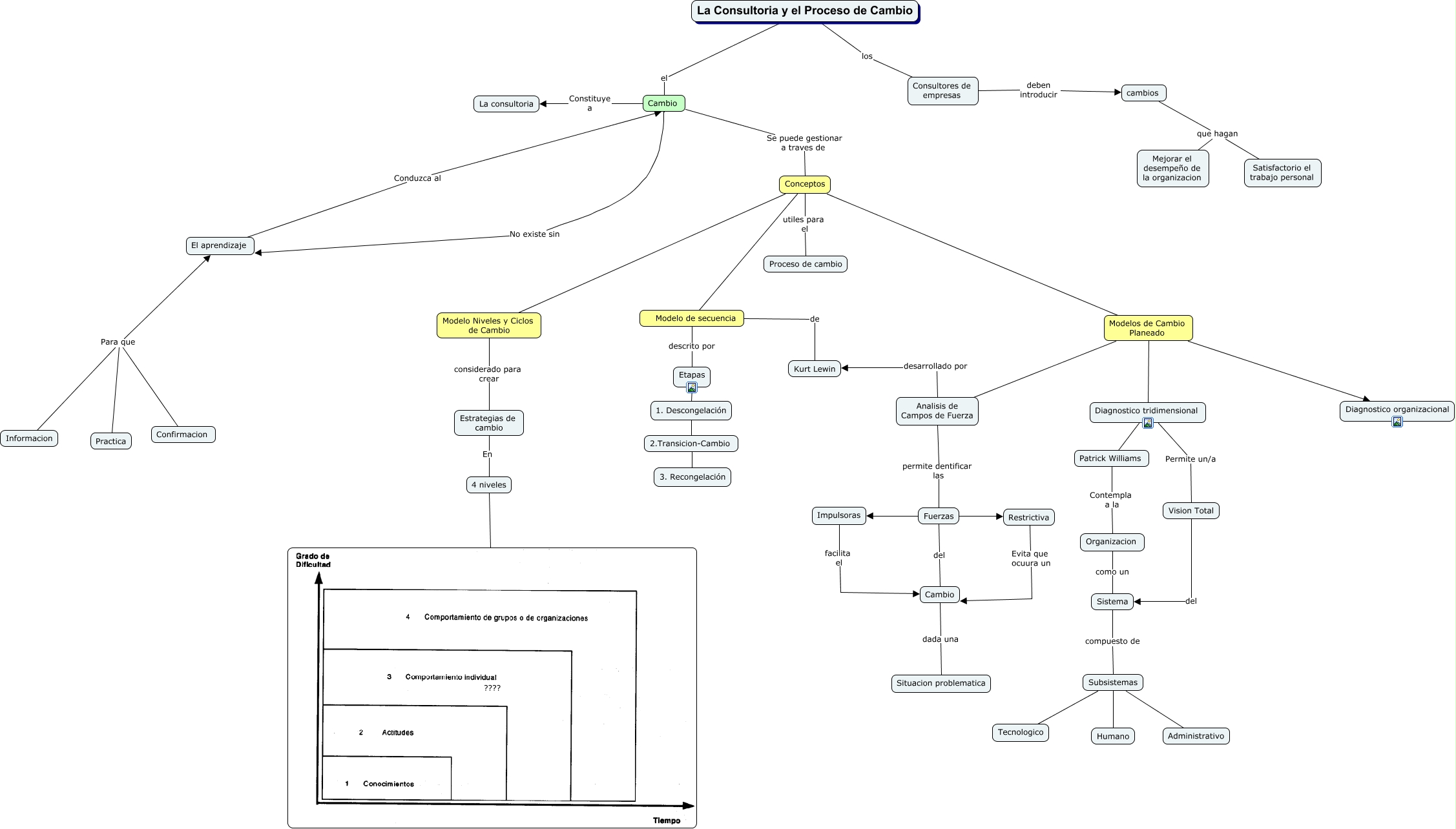 Este Cmap, tiene información relacionada con: proceso de cambio, Diagnostico tridimensional Patrick Williams, Informacion Para que El aprendizaje, Impulsoras facilita el Cambio, Diagnostico tridimensional Permite un/a Vision Total, Fuerzas Impulsoras, Conceptos utiles para el Proceso de cambio, Modelo de secuencia de Kurt Lewin, La Consultoria y el Proceso de Cambio los Consultores de empresas, Modelos de Cambio Planeado Analisis de Campos de Fuerza, Conceptos Modelo de secuencia, Etapas 1. Descongelación, La Consultoria y el Proceso de Cambio el Cambio, Modelos de Cambio Planeado Diagnostico tridimensional, Modelo de secuencia descrito por Etapas, cambios que hagan Mejorar el desempeño de la organizacion, Subsistemas Humano, 4 niveles ????, Restrictiva Evita que ocuura un Cambio, Confirmacion Para que El aprendizaje, Patrick Williams Contempla a la Organizacion