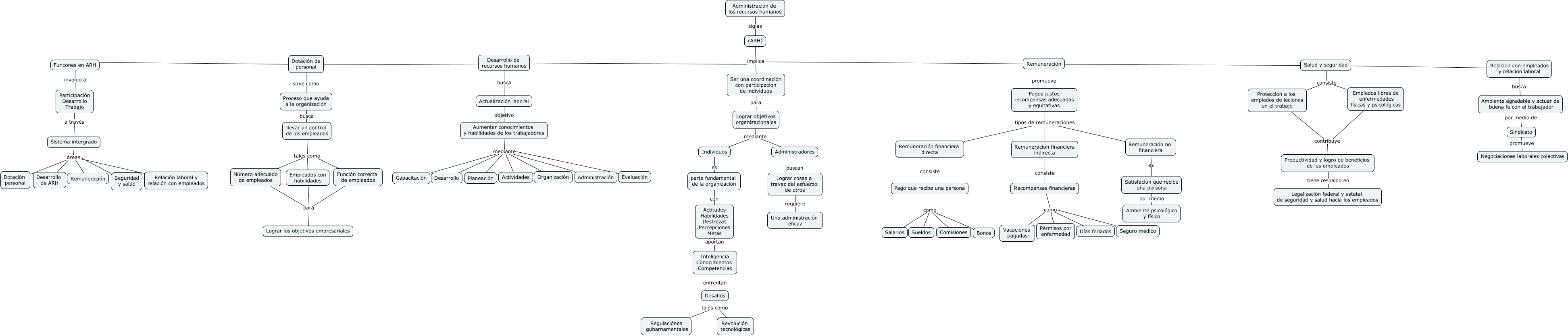 Este Cmap, tiene información relacionada con: 1.Definir la ARH, Satisfación que recibe una persona por medio Ambiente psicológico y físico, Capacitación mediante Planeación, Salud y seguridad consiste Protección a los empledos de leciones en el trabajo, Salarios como Sueldos, Remuneración promueve Pagos justos recompensas adecuadas y equitativas, Revolución tecnológicas tales como Regulaciónes gubarnamentales, Días feriados como Permisos por enfermedad, Número adecuado de empleados para Lograr los objetivos empresariales, Ambiente agradable y actuar de buena fe con el trabajador por medio de Sindicato, Seguridad y salud áreas Dotación personal, Bonos como Sueldos, Dotación de personal sirve como Proceso que ayuda a la organización, Desarrollo de recursos humanos busca Actualización laboral, Remuneración financiera directa tipos de remuneraciones Remuneración financiera indirecta, Lograr objetivos organizacionales mediante Administradores, Relación laboral y relación con empleados áreas Dotación personal, Empledos libres de enfermedades físicas y psicológicas contribuye Productividad y logro de beneficios de los empleados, Actualización laboral objetivo Aumentar conocimientos y habilidades de los trabajadores, Inteligencia Conocimientos Competencias enfrentan Desafios, (ARH) implica Ser una coordinación con participación de individuos