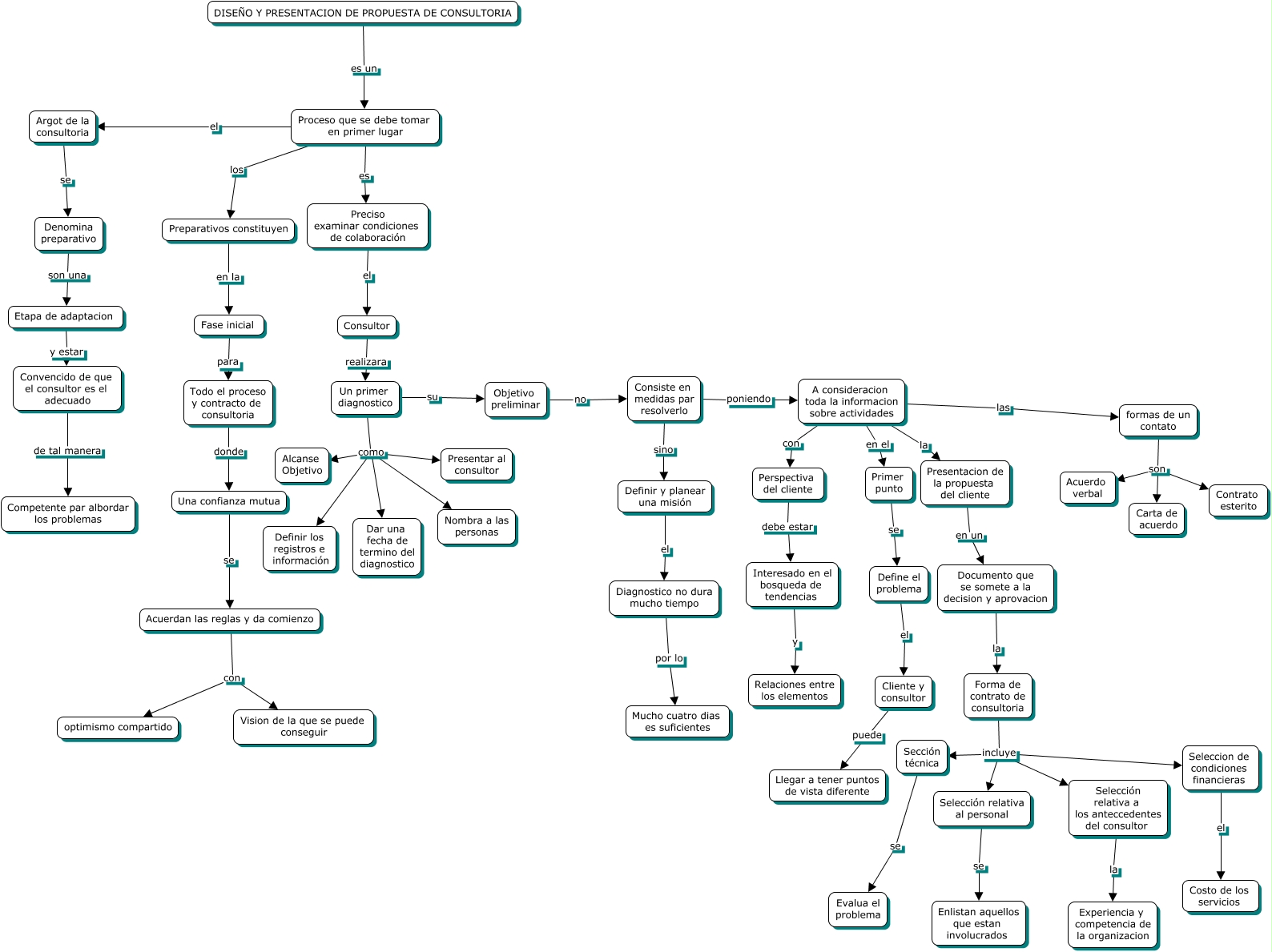 Este Cmap, tiene información relacionada con: Diseño y presentacion de propuesta de consultoria, Interesado en el bosqueda de tendencias y Relaciones entre los elementos, Forma de contrato de consultoria incluye Seleccion de condiciones financieras, A consideracion toda la informacion sobre actividades con Perspectiva del cliente, Documento que se somete a la decision y aprovacion la Forma de contrato de consultoria, Sección técnica se Evalua el problema, Etapa de adaptacion y estar Convencido de que el consultor es el adecuado, Argot de la consultoria se Denomina preparativo, Perspectiva del cliente debe estar Interesado en el bosqueda de tendencias, Consiste en medidas par resolverlo poniendo A consideracion toda la informacion sobre actividades, Convencido de que el consultor es el adecuado de tal manera Competente par albordar los problemas, Forma de contrato de consultoria incluye Sección técnica, A consideracion toda la informacion sobre actividades la Presentacion de la propuesta del cliente, Preparativos constituyen en la Fase inicial, A consideracion toda la informacion sobre actividades en el Primer punto, Forma de contrato de consultoria incluye Selección relativa a los anteccedentes del consultor, Primer punto se Define el problema, Acuerdan las reglas y da comienzo con Vision de la que se puede conseguir, Todo el proceso y contracto de consultoria donde Una confianza mutua, DISEÑO Y PRESENTACION DE PROPUESTA DE CONSULTORIA es un Proceso que se debe tomar en primer lugar, Un primer diagnostico como Alcanse Objetivo