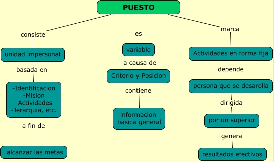 Este Cmap, tiene información relacionada con: 3.5 Puesto, por un superior genera resultados efectivos, Actividades en forma fija depende persona que se desarolla, PUESTO consiste unidad impersonal, PUESTO es variable, unidad impersonal basada en -Identificacion -Mision -Actividades -Jerarquia, etc., persona que se desarolla dirigida por un superior, PUESTO marca Actividades en forma fija, -Identificacion -Mision -Actividades -Jerarquia, etc. a fin de alcanzar las metas, Criterio y Posicion contiene informacion basica general, variable a causa de Criterio y Posicion