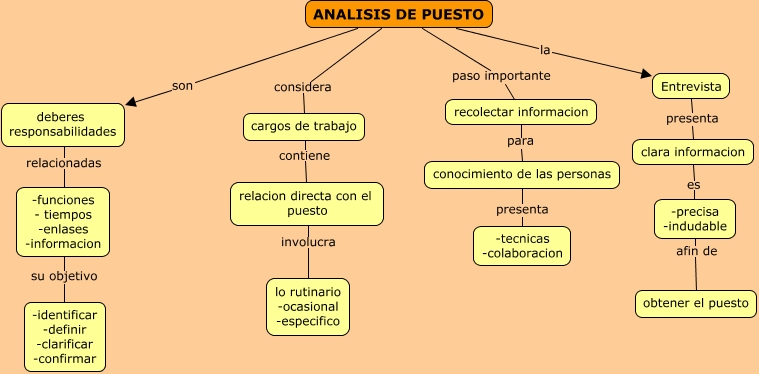 Este Cmap, tiene información relacionada con: 3.6 analisis de puestos, ANALISIS DE PUESTO la Entrevista, conocimiento de las personas presenta -tecnicas -colaboracion, recolectar informacion para conocimiento de las personas, -precisa -indudable afin de obtener el puesto, deberes responsabilidades relacionadas -funciones - tiempos -enlases -informacion, clara informacion es -precisa -indudable, ANALISIS DE PUESTO considera cargos de trabajo, ANALISIS DE PUESTO paso importante recolectar informacion, -funciones - tiempos -enlases -informacion su objetivo -identificar -definir -clarificar -confirmar, ANALISIS DE PUESTO son deberes responsabilidades, cargos de trabajo contiene relacion directa con el puesto, Entrevista presenta clara informacion, relacion directa con el puesto involucra lo rutinario -ocasional -especifico