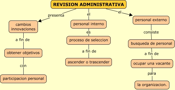 Este Cmap, tiene información relacionada con: 3.7 Revision administrativa, busqueda de personal a fin de ocupar una vacante, cambios innovaciones a fin de obtener objetivos, proceso de seleccion a fin de ascender o trascender, personal interno es proceso de seleccion, REVISION ADMINISTRATIVA el personal interno, ocupar una vacante para la organizacion., obtener objetivos con participacion personal, personal externo consiste busqueda de personal, REVISION ADMINISTRATIVA el personal externo, REVISION ADMINISTRATIVA presenta cambios innovaciones