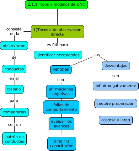 Este Cmap, tiene información relacionada con: Técnica de observación directa, 2.1.1 Tipos y modelos de DNC ???? 1)Técnica de observación directa, identificar necesidades sus desventajas, trabajo para compararlas, ventajas son fallas de comportamiento, compararlas con un patrón de conductas, 1)Técnica de observación directa consiste en la observación, ventajas son afirmaciones objetivas, observación de conductas, ventajas son dirigir la capacitación, identificar necesidades sus ventajas, 1)Técnica de observación directa es útil para identificar necesidades, desventajas son influir negativamente, desventajas son require preparación, ventajas son evaluar los avances, conductas en el trabajo, desventajas son costosa y larga