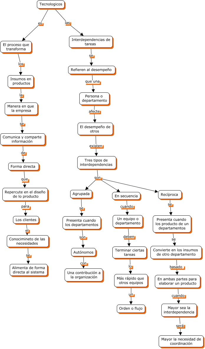 Este Cmap, tiene información relacionada con: FACTORES TECNOLOGICOS, Insumos en productos la Manera en que la empresa, Convierte en los insumos de otro departamento basado En ambas partes para elaborar un producto, Presenta cuando los producto de un departamentos se Convierte en los insumos de otro departamento, Tres tipos de interdependencias son Agrupada, Terminar ciertas tareas lo Más rápido que otros equipos, En ambas partes para elaborar un producto cuando Mayor sea la interdependencia, Persona o departamento afecte El desempeño de otros, Comunica y comparte información de Forma directa, Tres tipos de interdependencias son En secuencia, Recíproca se Presenta cuando los producto de un departamentos, Forma directa que Repercute en el diseño de lo producto, Los clientes el Conocimineto de las necesidades, Repercute en el diseño de lo producto para Los clientes, El desempeño de otros existen Tres tipos de interdependencias, Refieren al desempeño que una Persona o departamento, En secuencia cuando Un equipo o departamento, El proceso que transforma los Insumos en productos, Tres tipos de interdependencias son Recíproca, Conocimineto de las necesidades se Alimenta de forma directa al sistema, Interdependencias de tareas se Refieren al desempeño