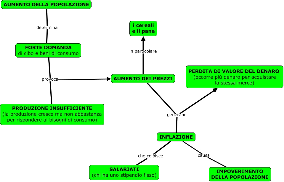 Questa Cmap, creata con IHMC CmapTools, contiene informazioni relative a: Economia '500, AUMENTO DEI PREZZI generano PERDITA DI VALORE DEL DENARO (occorre più denaro per acquistare la stessa merce), FORTE DOMANDA di cibo e beni di consumo provoca PRODUZIONE INSUFFICIENTE (la produzione cresce ma non abbastanza per rispondere ai bisogni di consumo), INFLAZIONE causa IMPOVERIMENTO DELLA POPOLAZIONE, AUMENTO DELLA POPOLAZIONE determina, AUMENTO DEI PREZZI in particolare i cereali e il pane, INFLAZIONE che colpisce SALARIATI (chi ha uno stipendio fisso), AUMENTO DEI PREZZI generano INFLAZIONE, FORTE DOMANDA di cibo e beni di consumo provoca AUMENTO DEI PREZZI