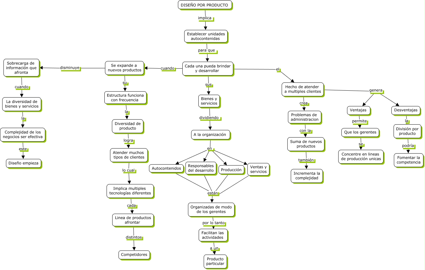 Este Cmap, tiene información relacionada con: DISEÑO POR PRODUCTO, Diversidad de producto logra Atender muchos tipos de clientes, La diversidad de bienes y servicios la Complejidad de los negocios ser efectiva, Sobrecarga de información que afronta cuando La diversidad de bienes y servicios, Cada una pueda brindar y desarrollar sus Bienes y servicios, Bienes y servicios dividiendo A la organización, Facilitan las actividades a un Producto particular, Problemas de administracion con la Suma de nuevos productos, Hecho de atender a multiples clientes genera Desventajas, A la organización en Responsables del desarrollo, Autocontenidos están Organizadas de modo de los gerentes, Producción están Organizadas de modo de los gerentes, A la organización en Autocontenidos, Desventajas la División por producto, Hecho de atender a multiples clientes genera Ventajas, Estructura funciona con frecuencia la Diversidad de producto, Complejidad de los negocios ser efectiva este Diseño empieza, Ventajas permite Que los gerentes, Hecho de atender a multiples clientes crea Problemas de administracion, Responsables del desarrollo están Organizadas de modo de los gerentes, Ventas y servicios están Organizadas de modo de los gerentes