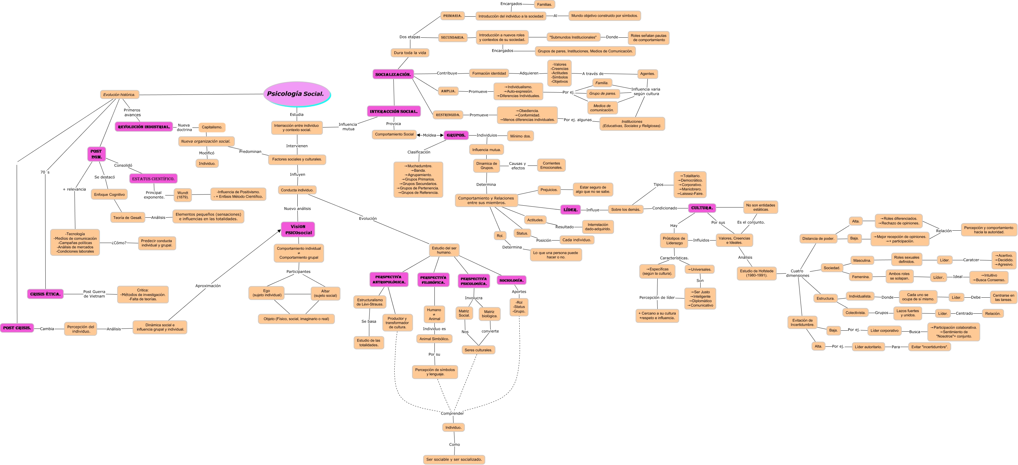 Este Cmap, tiene información relacionada con: Psicología Social final, Post 2GM. + relevancia -Tecnología -Medios de comunicación -Campañas políticas -Análisis de mercados -Condiciones laborales, Cultura. ???? No son entidades estáticas., Status. Posición Cada individuo., Alter (sujeto social) ???? Ego (sujeto individual), Sobre los demás. Tipos →Totalitario. →Democrático. →Corporativo. →Maniobrero. →Laissez-Faire., Introducción del individuo a la sociedad Al Mundo objetivo construido por símbolos., PsicologíaSocial. ???? Evolución histórica., Ambos roles se solapan. ???? Líder., Evolución histórica. 70´s Crisis Ética., Agentes. Influencia varia según cultura Familia., Perspectiva Antropológica. ???? Estudio del ser humano., Masculina. ???? Roles sexuales definidos., Cada uno se ocupa de sí mismo. ???? Líder., Perspectiva Psicologíca. Involucra Matriz Social., Interacción Social. ???? Socialización., Individualista. Donde Cada uno se ocupa de sí mismo., Sociedad. ???? Femenina., Perspectiva Filosófica. ???? Estudio del ser humano., Capitalismo. Nueva doctrina Revolución Industrial., Prótotipos de Liderazgo Características. →Universales.