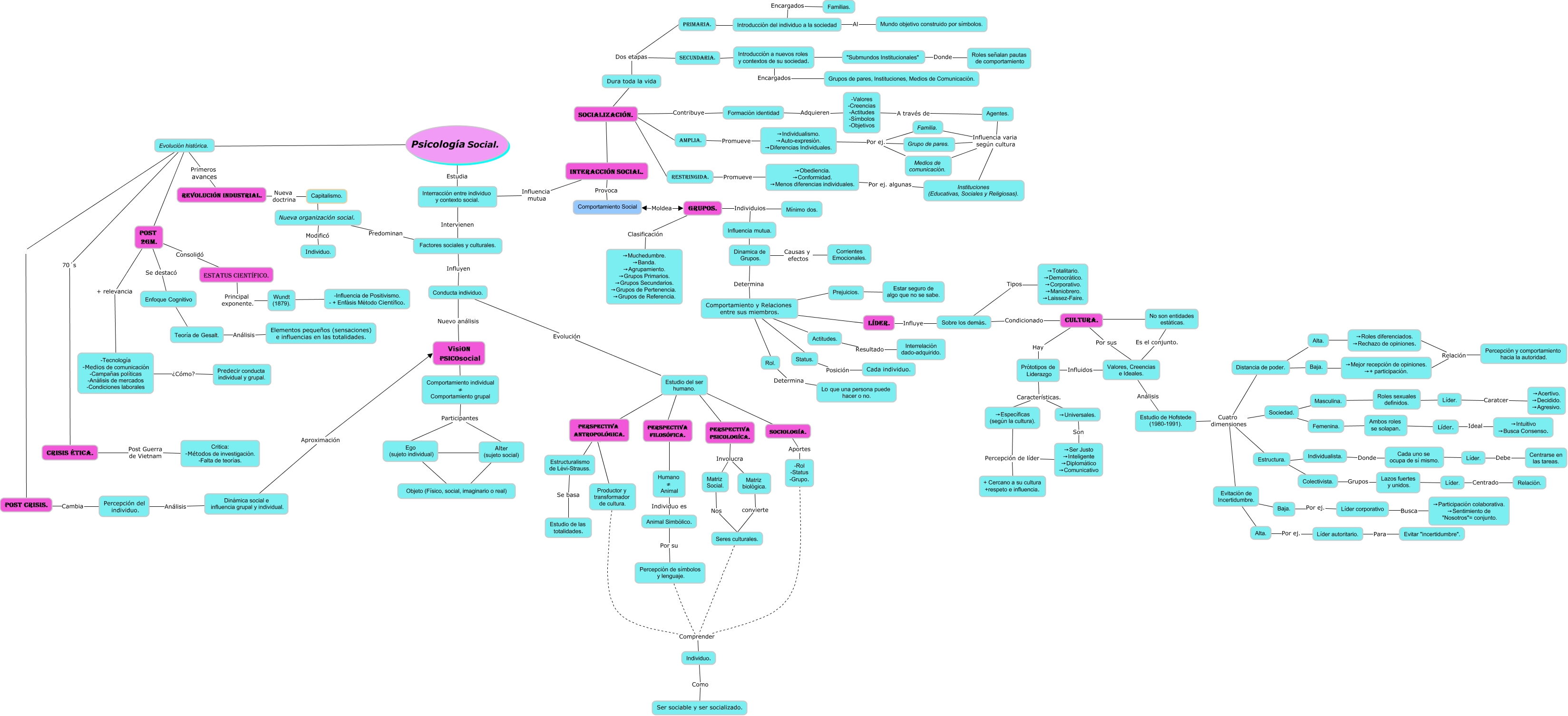 Este Cmap, tiene información relacionada con: Psicología Social violeta y celeste, Post 2GM. + relevancia -Tecnología -Medios de comunicación -Campañas políticas -Análisis de mercados -Condiciones laborales, Cultura. ???? No son entidades estáticas., Status. Posición Cada individuo., Alter (sujeto social) ???? Ego (sujeto individual), Sobre los demás. Tipos →Totalitario. →Democrático. →Corporativo. →Maniobrero. →Laissez-Faire., Introducción del individuo a la sociedad Al Mundo objetivo construido por símbolos., PsicologíaSocial. ???? Evolución histórica., Ambos roles se solapan. ???? Líder., Evolución histórica. 70´s Crisis Ética., Agentes. Influencia varia según cultura Familia., Perspectiva Antropológica. ???? Estudio del ser humano., Masculina. ???? Roles sexuales definidos., Cada uno se ocupa de sí mismo. ???? Líder., Perspectiva Psicologíca. Involucra Matriz Social., Interacción Social. ???? Socialización., Individualista. Donde Cada uno se ocupa de sí mismo., Sociedad. ???? Femenina., Perspectiva Filosófica. ???? Estudio del ser humano., Capitalismo. Nueva doctrina Revolución Industrial., Prótotipos de Liderazgo Características. →Universales.