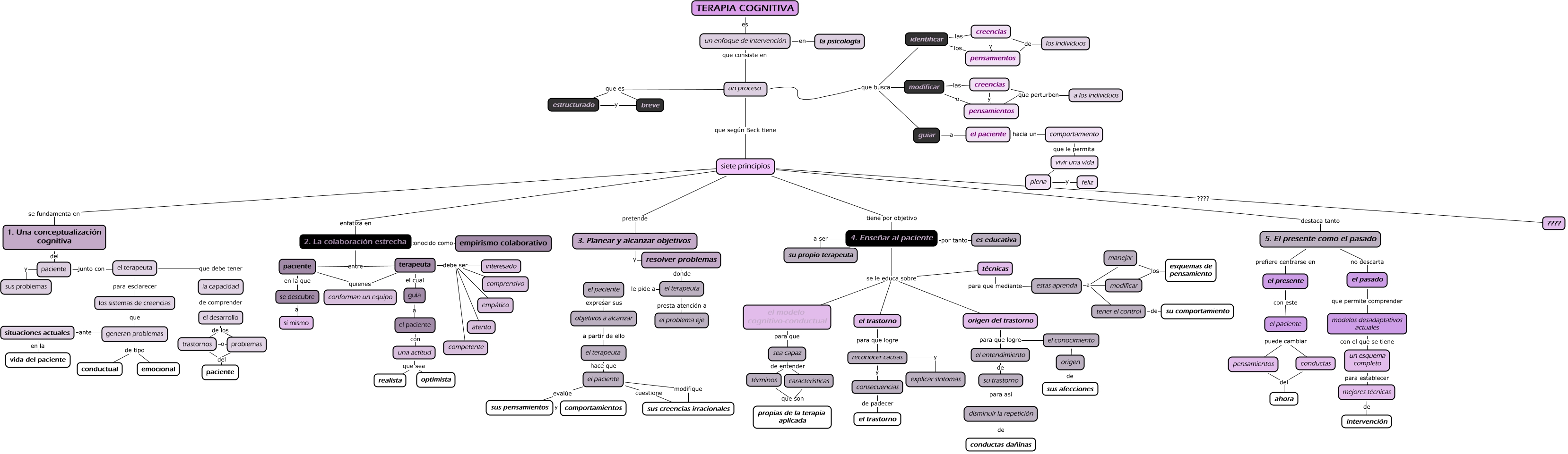Este Cmap, tiene información relacionada con: Principios de la Terapia Cognitiva, origen de sus afecciones, paciente y sus problemas, trastornos o problemas, el presente con este el paciente, el entendimiento de su trastorno, terapeuta debe ser interesado, siete principios destaca tanto 5. El presente como el pasado, sus pensamientos y comportamientos, el paciente hacia un comportamiento, el paciente expresar sus objetivos a alcanzar, tener el control de su comportamiento, el paciente modifique sus creencias irracionales, estructurado y breve, 4. Enseñar al paciente a ser su propio terapeuta, creencias y pensamientos, 4. Enseñar al paciente se le educa sobre técnicas, 1. Una conceptualización cognitiva del paciente, modificar o pensamientos, siete principios tiene por objetivo 4. Enseñar al paciente, el terapeuta para esclarecer los sistemas de creencias