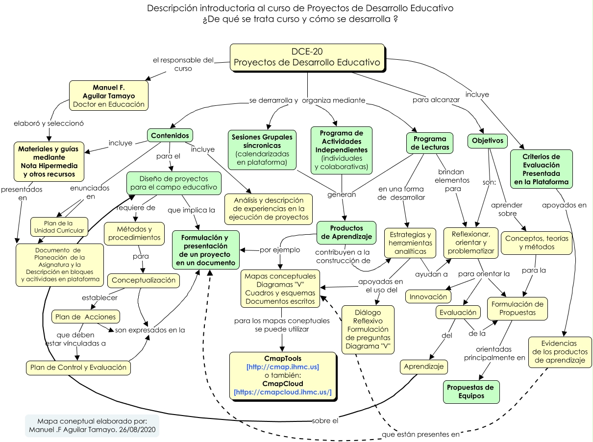 Este Cmap, tiene información relacionada con: 2020 Desarrollo de Proyectos Educativos Licenciatura, DCE-20 Proyectos de Desarrollo Educativo para alcanzar Objetivos, Contenidos para el Diseño de proyectos para el campo educativo, Estrategias y herramientas analíticas apoyadas en el uso del Diálogo Reflexivo Formulación de preguntas Diagrama "V", Sesiones Grupales síncronicas (calendarizadas en plataforma) generan Productos de Aprendizaje, Estrategias y herramientas analíticas apoyadas en el uso del Mapas conceptuales Diagramas "V" Cuadros y esquemas Documentos escritos, Materiales y guías mediante Nota Hipermedia y otros recursos presentados en Documento de Planeación de la Asignatura y la Descripción en bloques y acitividaes en plataforma, Manuel F. Aguilar Tamayo Doctor en Educación elaboró y seleccionó Materiales y guías mediante Nota Hipermedia y otros recursos, Contenidos enunciados en Documento de Planeación de la Asignatura y la Descripción en bloques y acitividaes en plataforma, Plan de Acciones que deben estar vínculadas a Plan de Control y Evaluación, Formulación de Propuestas orientadas principalmente en Propuestas de Equipos, Objetivos son: Reflexionar, orientar y problematizar, Productos de Aprendizaje contribuyen a la construcción de Estrategias y herramientas analíticas, DCE-20 Proyectos de Desarrollo Educativo se derrarrolla y organiza mediante Programa de Lecturas, Contenidos incluye Materiales y guías mediante Nota Hipermedia y otros recursos, DCE-20 Proyectos de Desarrollo Educativo el responsable del curso Manuel F. Aguilar Tamayo Doctor en Educación, Productos de Aprendizaje por ejemplo Formulación y presentación de un proyecto en un documento, Aprendizaje sobre el Diseño de proyectos para el campo educativo, Conceptualización son expresados en la Formulación y presentación de un proyecto en un documento, Evidencias de los productos de aprendizaje que están presentes en Mapas conceptuales Diagramas "V" Cuadros y esquemas Documentos escritos, Mapas conceptuales Diagramas "V" Cuadros y esquemas Documentos escritos para los mapas coneptuales se puede utilizar CmapTools [http://cmap.ihmc.us] o también: CmapCloud [https://cmapcloud.ihmc.us/]