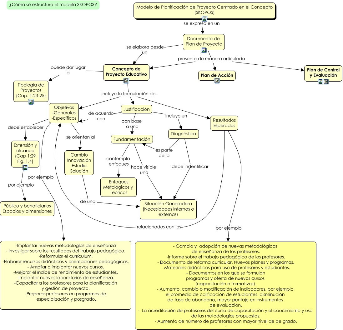 Este Cmap, tiene información relacionada con: El Modelo de Planificacion de Proyectos SKOPOS, Documento de Plan de Proyecto presenta de manera articulada Plan de Control y Evaluación, Resultados Esperados relacionados con los Objetivos -Generales -Específicos, Resultados Esperados por ejemplo - Cambio y adopción de nuevas metodológicas de enseñanza de los profesores. -Informe sobre el trabajo pedagógico de los profesores. - Documento de reforma curricular. Nuevos planes y programas. - Materiales didácticos para uso de profesores y estudiantes. - Documentos en los que se formulan programas y oferta de nuevos cursos (capacitación o formativos). - Aumento, cambio o modificación de indicadores, por ejemplo el promedio de calificación de estudiantes, disminución de tasa de abandono, mayor puntaje en instrumentos de evaluación. - La acreditación de profesores del curso de capacitación y el coocimiento y uso de las metodologías propuestas. - Aumento de número de profesores con mayor nivel de de grado. -, Fundamentación contempla enfoques Enfoques Metológicos y Teóricos, Fundamentación hace visible una Situación Generadora (Necesidades Internas o externas), Concepto de Proyecto Educativo incluye la formulación de Objetivos -Generales -Específicos, Justificación incluye un Diagnóstico, Concepto de Proyecto Educativo incluye la formulación de Justificación, Documento de Plan de Proyecto presenta de manera articulada Concepto de Proyecto Educativo, Documento de Plan de Proyecto presenta de manera articulada Plan de Acción, Diagnóstico es parte de la Fundamentación, Concepto de Proyecto Educativo incluye la formulación de Resultados Esperados, Justificación de acuerdo con Objetivos -Generales -Específicos, Concepto de Proyecto Educativo puede dar lugar a Tipología de Proyectos (Cap. 1:23-25), Justificación con base a una Fundamentación, Objetivos -Generales -Específicos por ejemplo -Implantar nuevas metodologías de enseñanza - Investigar sobre los resultados del trabajo pedagógico. -Reformular el currículum. -Elaborar recursos didácticos y orientaciones pedagógicas. - Ampliar o implantar nuevos cursos. -Mejorar el índice de rendimiento de estudiantes. -Implantar nuevos laboratorios de enseñanza. -Capacitar a los profesores para la planificación y gestión de proyecto. -Preparar profesores en programas de especialización y posgrado., Objetivos -Generales -Específicos debe establecer Extensión y alcance (Cap 1:29 Fig. 1.4), Cambio Innovación Estudio Solución de una Situación Generadora (Necesidades Internas o externas), Documento de Plan de Proyecto se elabora desde un Concepto de Proyecto Educativo, Objetivos -Generales -Específicos se orientan al Cambio Innovación Estudio Solución