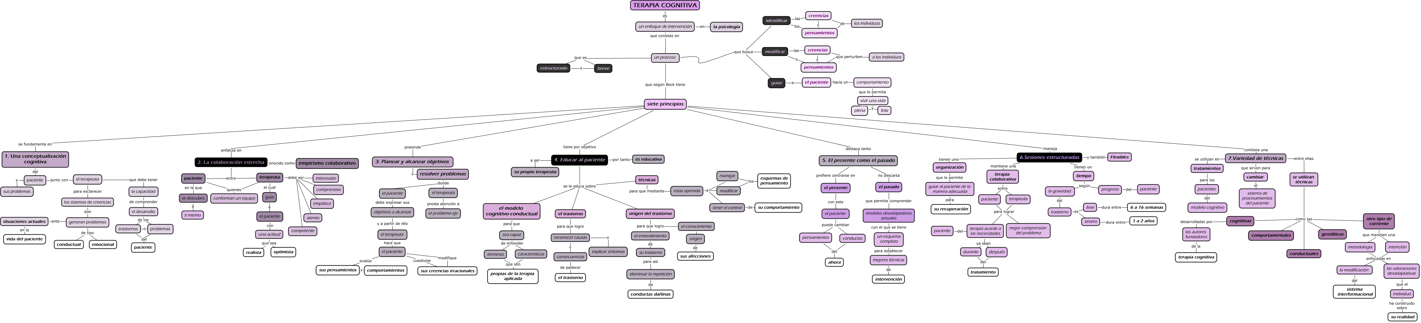 Este Cmap, tiene información relacionada con: PRINCIPIOS DE LA TERAPIA COGNITIVA, si, identificar los pensamientos, terapeuta debe ser interesado, se utilizan técnicas como las comportamentales, terapeuta debe ser atento, creencias y pensamientos, origen del trastorno para que logre el conocimiento, paciente para lograr terapia acorde a las nececidades, vivir una vida y feliz, después del tratamiento, resolver problemas donde el paciente, origen de sus afecciones, modificar las creencias, metodología enfocadas en las valoraciones desadaptativas, terapeuta debe ser empático, siete principios se fundamenta en 1. Una conceptualización cognitiva, trastornos o problemas, origen del trastorno para que logre el entendimiento, estas aprenda a tener el control, 5. El presente como el pasado no descarta el pasado, un esquema completo para establecer mejores técnicas