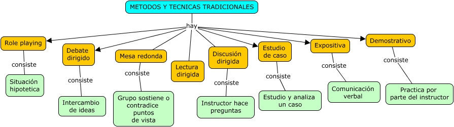 Este Cmap, tiene información relacionada con: METODOS Y TECNICAS TRADICIONALES, METODOS Y TECNICAS TRADICIONALES hay Expositiva, METODOS Y TECNICAS TRADICIONALES hay Debate dirigido, METODOS Y TECNICAS TRADICIONALES hay Lectura dirigida, METODOS Y TECNICAS TRADICIONALES hay Role playing, Expositiva consiste Comunicación verbal, METODOS Y TECNICAS TRADICIONALES hay Demostrativo, Debate dirigido consiste Intercambio de ideas, METODOS Y TECNICAS TRADICIONALES hay Discusión dirigida, Demostrativo consiste Practica por parte del instructor, METODOS Y TECNICAS TRADICIONALES hay Estudio de caso, Mesa redonda consiste Grupo sostiene o contradice puntos de vista, Discusión dirigida consiste Instructor hace preguntas, Estudio de caso consiste Estudio y analiza un caso, METODOS Y TECNICAS TRADICIONALES hay Mesa redonda, Role playing consiste Situación hipotetica