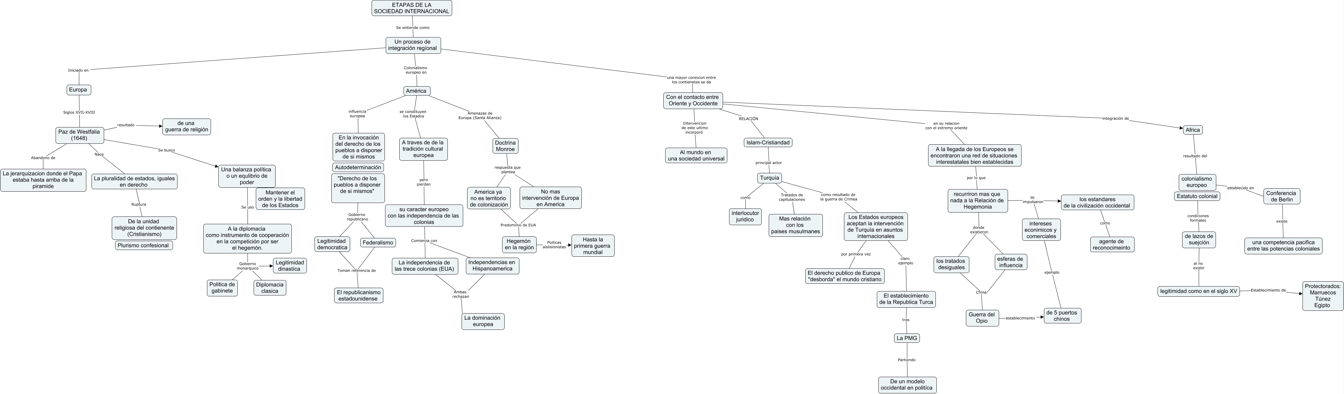 This Concept Map, created with IHMC CmapTools, has information related to: ETAPAS DE LA SOCIEDAD INTERNACIONAL, A la diplomacia como instrumento de cooperación en la competición por ser el hegemón. Gobierno monarquico Legitimidad dinastíca, Con el contacto entre Oriente y Occidente Intervencion de este ultimo incorporó Al mundo en una sociedad universal, Conferencia de Berlin existe una competencia pacifica entre las potencias coloniales, Turquía Tratados de capitulaciones Mas relación con los paises musulmanes, Estatuto colonial condiciones formales de lazos de suejción, América influencia europea En la invocación del derecho de los pueblos a disponer de si mismos, La independencia de las trece colonias (EUA) Ambas rechazan La dominación europea, Africa resultado del colonialismo europeo, legitimidad como en el siglo XV Establecimiento de Protectorados: Marruecos Túnez Egipto, Turquía como interlocutor juridico, Un proceso de integración regíonal Colonialismo europeo en América, Con el contacto entre Oriente y Occidente en su relacion con el extremo oriente A la llegada de los Europeos se encontraron una red de situaciones interestatales bien establecidas, A la llegada de los Europeos se encontraron una red de situaciones interestatales bien establecidas por lo que recurriron mas que nada a la Relación de Hegemonia, ETAPAS DE LA SOCIEDAD INTERNACIONAL Se entiende como Un proceso de integración regíonal, La pluralidad de estados, iguales en derecho Ruptura De la unidad religiosa del contienente (Cristianismo), Turquía como resultado de la guerra de Crimea Los Estados europeos aceptan la intervención de Turquía en asuntos internacionales, La PMG Partiendo De un modelo occidental en politíca, Paz de Westfalia (1648) resultado de una guerra de religión, intereses econimicos y comerciales ejemplo de 5 puertos chinos, "Derecho de los pueblos a disponer de si mismos" Gobierno republicano Federalismo