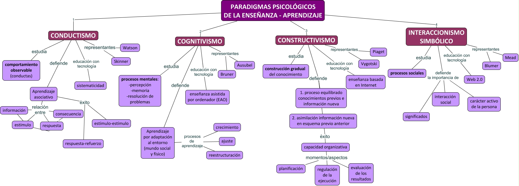 Este Cmap, tiene información relacionada con: Paradigmas psicológicos de la enseñanza-aprendizaje, CONSTRUCTIVISMO estudia construcción gradual del conocimiento, COGNITIVISMO representantes Bruner, PARADIGMAS PSICOLÓGICOS DE LA ENSEÑANZA - APRENDIZAJE 2 COGNITIVISMO, Aprendizaje asociativo éxito respuesta-refuerzo, COGNITIVISMO educación con tecnología enseñanza asistida por ordenador (EAO), estímulo respuesta, CONDUCTISMO estudia comportamiento observable (conductas), CONDUCTISMO representantes Skinner, Aprendizaje asociativo relación entre información, respuesta consecuencia, INTERACCIONISMO SIMBÓLICO representantes Mead, Aprendizaje asociativo relación entre estímulo, información estímulo, Aprendizaje asociativo relación entre respuesta, capacidad organizativa momentos/aspectos evaluación de los resultados, INTERACCIONISMO SIMBÓLICO defiende la importancia de carácter activo de la persona, CONDUCTISMO representantes Watson, Aprendizaje asociativo éxito estímulo-estímulo, capacidad organizativa momentos/aspectos regulación de la ejecución, COGNITIVISMO estudia procesos mentales: -percepción -memoria -resolución de problemas