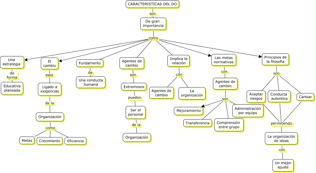 Este Cmap, tiene información relacionada con: CARACTERISTICAS DEL DO, Implica la relación con Agentes de cambio, De gran importancia como El cambio, Agentes de cambio son Comprensión entre grupo, Implica la relación con La organización, CARACTERISTICAS DEL DO son De gran importancia, De gran importancia como Las metas normativas, Principios de la filosofia son Aceptar riesgos, De gran importancia como Agentes de cambio, Agentes de cambio son Extremosos, De gran importancia como Una estrategia, Agentes de cambio son Administración por equipo, Extremosos pueden Ser el personal, Agentes de cambio son Mejoramiento, Organización como Crecimiento, Principios de la filosofia son Conducta autentica, El cambio esta Ligado a exigencias, De gran importancia como Principios de la filosofia, Agentes de cambio son Transferencia, La organización de ideas con Un mejor ajuste, Las metas normativas con Agentes de cambio