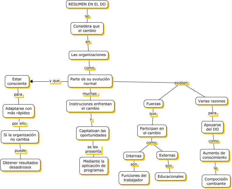 Este Cmap, tiene información relacionada con: RESUMEN EN EL DO, Las organizaciones como Parte de su evolución normal, Aumento de conocimiento la Compocisión cambiante, Fuerzas que Participan en el cambio, Considera que el cambio en Las organizaciones, RESUMEN EN EL DO se Considera que el cambio, Parte de su evolución normal muchas Instiruciones enfrentan el cambio, Participan en el cambio como Internas, Varias razones para Apoyarse del DO, Adaptarse con más rápidez por ello Si la organización no cambia, Estar consciente para Adaptarse con más rápidez, Externas son Educacionales, Participan en el cambio como Externas, Parte de su evolución normal existen Varias razones, Si la organización no cambia puede Obtener resultados desastrosos, Internas son Funciones del trabajador, Instiruciones enfrentan el cambio y Capitalizan las oportunidades, Capitalizan las oportunidades se les presenta Mediante la aplicación de programas, Parte de su evolución normal y que Estar consciente, Apoyarse del DO como Aumento de conocimiento, Parte de su evolución normal existen Fuerzas