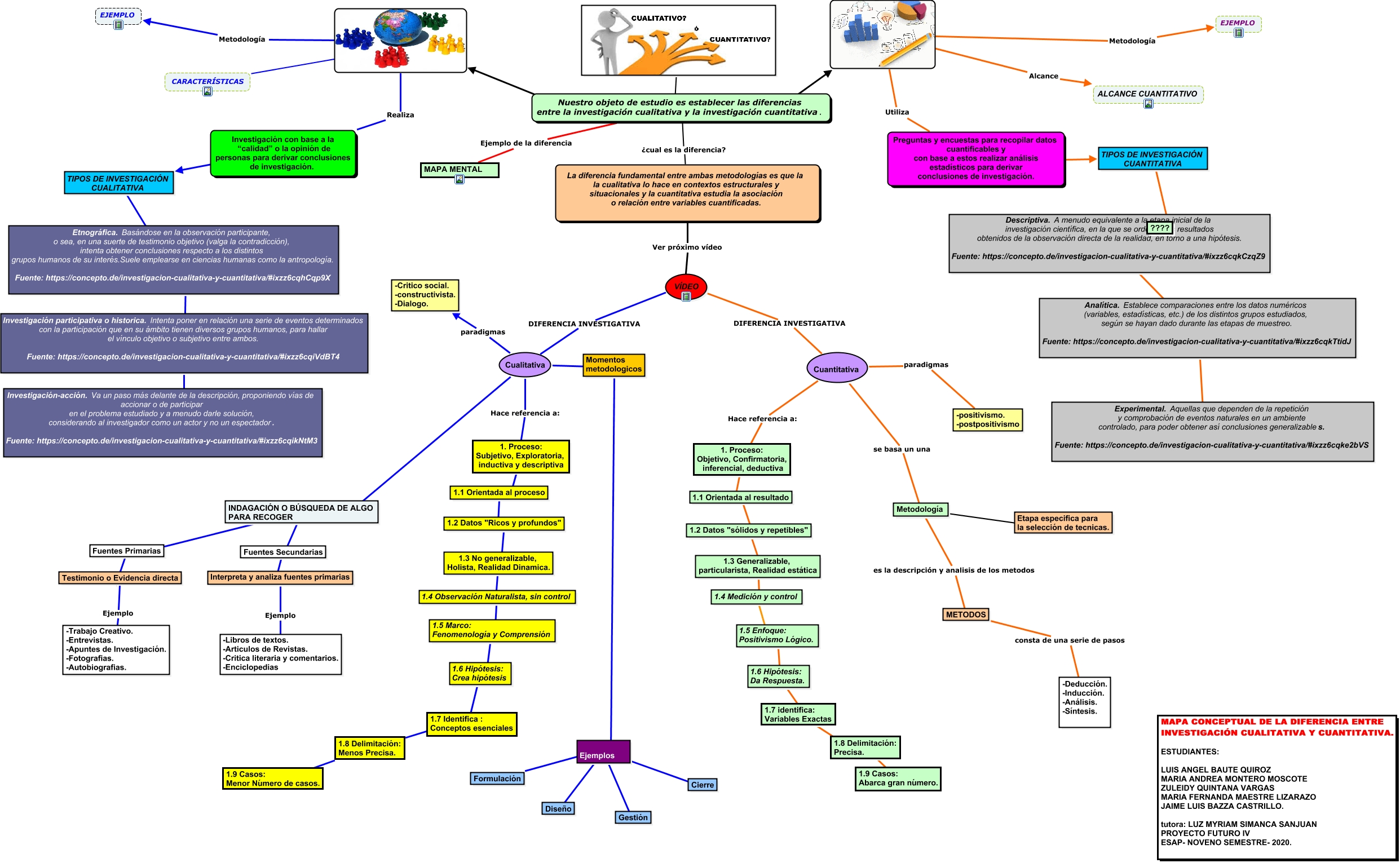 This Concept Map, created with IHMC CmapTools, has information related to: MAPA CONCEPTUAL OFICIAL-TRABAJO, TIPOS DE INVESTIGACIÓN CUANTITATIVA ???? ????, 1.5 Marco: Fenomenología y Comprensión ???? 1.6 Hipótesis: Crea hipótesis, Metodología EJEMPLO, INDAGACIÓN O BÚSQUEDA DE ALGO PARA RECOGER ???? Fuentes Secundarias, Metodología EJEMPLO, Fuentes Secundarias ???? Interpreta y analiza fuentes primarias, Testimonio o Evidencia directa Ejemplo -Trabajo Creativo. -Entrevistas. -Apuntes de Investigación. -Fotografias. -Autobiografias., Metodología es la descripción y analisis de los metodos METODOS, Alcance ALCANCE CUANTITATIVO, 1.6 Hipótesis: Crea hipótesis ???? 1.7 Identifica : Conceptos esenciales, Fuentes Primarias ???? Testimonio o Evidencia directa, Nuestro objeto de estudio es establecer las diferencias entre la investigación cualitativa y la investigación cuantitativa. ????, Metodología ???? Etapa especifica para la selección de tecnicas., Cualitativa ???? INDAGACIÓN O BÚSQUEDA DE ALGO PARA RECOGER, 1. Proceso: Subjetivo, Exploratoria, inductiva y descriptiva ???? 1.1 Orientada al proceso, Nuestro objeto de estudio es establecer las diferencias entre la investigación cualitativa y la investigación cuantitativa. ????, La diferencia fundamental entre ambas metodologías es que la la cualitativa lo hace en contextos estructurales y situacionales y la cuantitativa estudia la asociación o relación entre variables cuantificadas. Ver próximo vídeo VÍDEO, 1.6 Hipótesis: Crea hipótesis ???? 1.8 Delimitación: Menos Precisa., 1.1 Orientada al proceso ???? 1.2 Datos "Ricos y profundos", 1.8 Delimitación: Precisa. ???? 1.9 Casos: Abarca gran número.