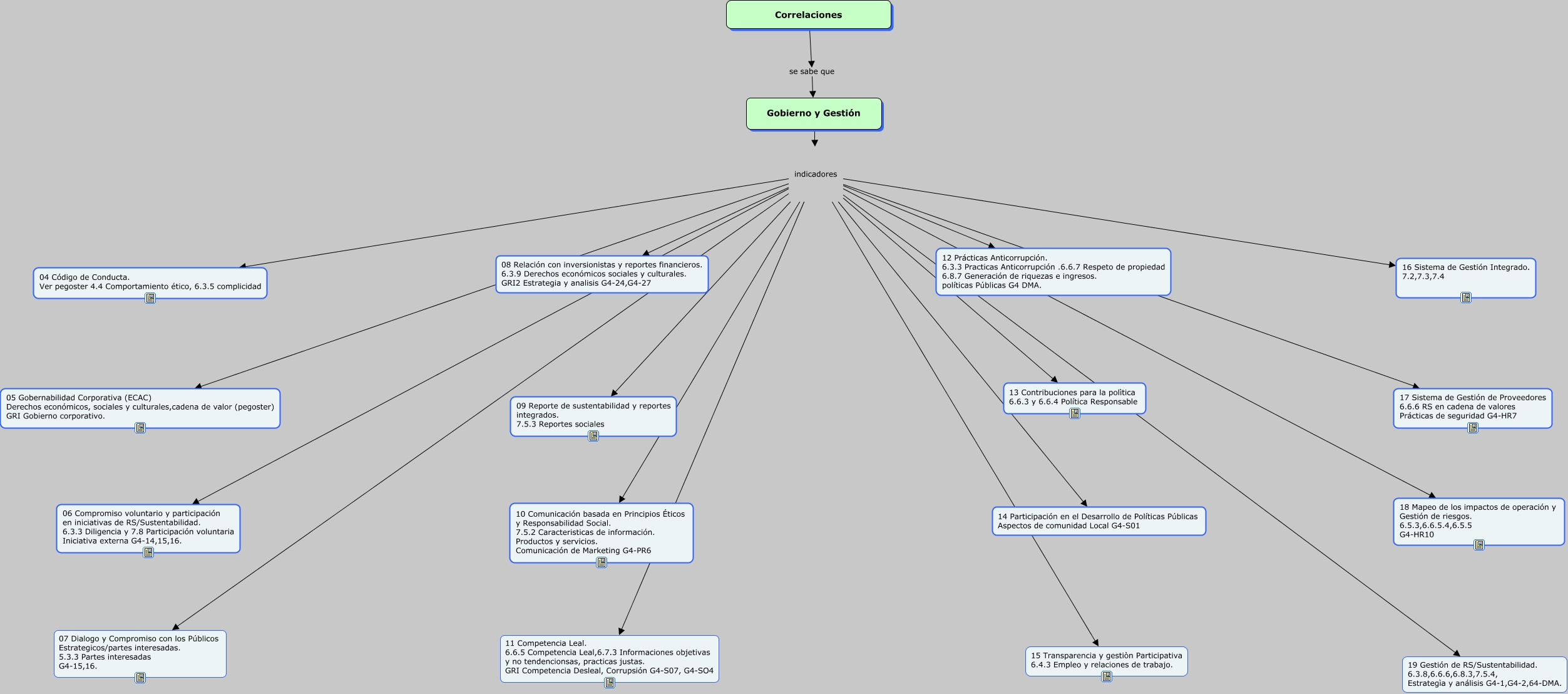 Este Cmap, tiene información relacionada con: Correlación Gobierno y Gestión, Gobierno y Gestión indicadores 16 Sistema de Gestión Integrado. 7.2,7.3,7.4, Gobierno y Gestión indicadores 12 Prácticas Anticorrupción. 6.3.3 Practicas Anticorrupción .6.6.7 Respeto de propiedad 6.8.7 Generación de riquezas e ingresos. políticas Públicas G4 DMA., Gobierno y Gestión indicadores 17 Sistema de Gestión de Proveedores 6.6.6 RS en cadena de valores Prácticas de seguridad G4-HR7, Gobierno y Gestión indicadores 09 Reporte de sustentabilidad y reportes integrados. 7.5.3 Reportes sociales, Gobierno y Gestión indicadores 15 Transparencia y gestiòn Participativa 6.4.3 Empleo y relaciones de trabajo., Gobierno y Gestión indicadores 13 Contribuciones para la polìtica 6.6.3 y 6.6.4 Política Responsable, Gobierno y Gestión indicadores 11 Competencia Leal. 6.6.5 Competencia Leal,6.7.3 Informaciones objetivas y no tendencionsas, practicas justas. GRI Competencia Desleal, Corrupsión G4-S07, G4-SO4, Gobierno y Gestión indicadores 18 Mapeo de los impactos de operación y Gestión de riesgos. 6.5.3,6.6.5.4,6.5.5 G4-HR10, Gobierno y Gestión indicadores 06 Compromiso voluntario y participación en iniciativas de RS/Sustentabilidad. 6.3.3 Diligencia y 7.8 Participación voluntaria Iniciativa externa G4-14,15,16., Gobierno y Gestión indicadores 05 Gobernabilidad Corporativa (ECAC) Derechos económicos, sociales y culturales,cadena de valor (pegoster) GRI Gobierno corporativo., Gobierno y Gestión indicadores 10 Comunicación basada en Principios Éticos y Responsabilidad Social. 7.5.2 Caracteristicas de información. Productos y servicios. Comunicación de Marketing G4-PR6, Gobierno y Gestión indicadores 04 Código de Conducta. Ver pegoster 4.4 Comportamiento ético, 6.3.5 complicidad, Gobierno y Gestión indicadores 08 Relación con inversionistas y reportes financieros. 6.3.9 Derechos económicos sociales y culturales. GRI2 Estrategia y analisis G4-24,G4-27, Gobierno y Gestión indicadores 07 Dialogo y Compromiso con los Públicos Estrategicos/partes interesadas. 5.3.3 Partes interesadas G4-15,16., Correlaciones se sabe que Gobierno y Gestión, Gobierno y Gestión indicadores 19 Gestión de RS/Sustentabilidad. 6.3.8,6.6.6,6.8.3,7.5.4, Estrategìa y análisis G4-1,G4-2,64-DMA., Gobierno y Gestión indicadores 14 Participación en el Desarrollo de Políticas Públicas Aspectos de comunidad Local G4-S01