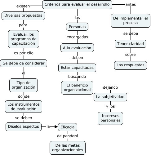 Este Cmap, tiene información relacionada con: 4.2, Los instrumentos de evaluación se deben Diselos aspectos, Tener claridad sobre Las respuestas, Personas encargadas A la evaluación, Diversas propuestas para Evaluar los programas de capacitación, Criterios para evaluar el desarrollo las Personas, Estar capacitadas buscando El beneficio organizacional, El beneficio organizacional dejando La subjetividad, Tipo de organización donde Los instrumentos de evaluación, Se debe de considerar el Tipo de organización, Criterios para evaluar el desarrollo existen Diversas propuestas, La subjetividad y los Intereses personales, Eficacia de penderá De las metas organizacionales, Diselos aspectos la Eficacia, Evaluar los programas de capacitación es por ello Se debe de considerar, Criterios para evaluar el desarrollo antes De implementar el proceso, A la evaluación deben Estar capacitadas, De implementar el proceso se debe Tener claridad