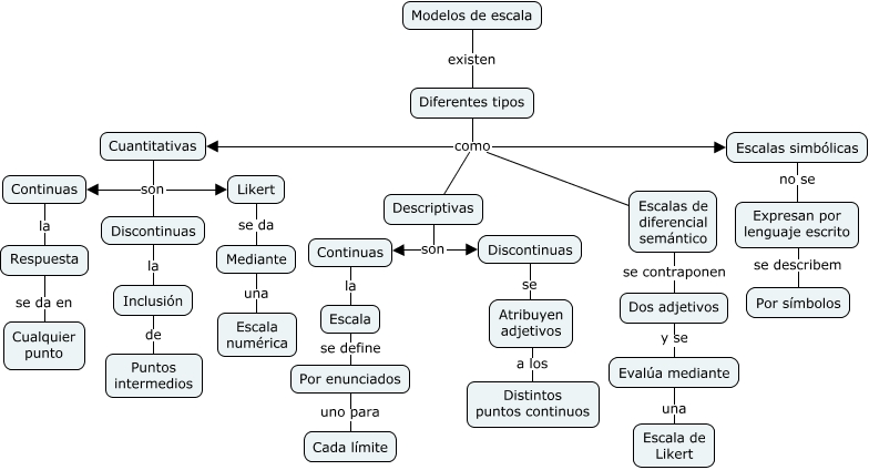 Este Cmap, tiene información relacionada con: 4.2.1.1, Continuas la Escala, Por enunciados uno para Cada límite, Continuas la Respuesta, Descriptivas son Discontinuas, Cuantitativas son Continuas, Cuantitativas son Discontinuas, Modelos de escala existen Diferentes tipos, Cuantitativas son Likert, Escalas de diferencial semántico se contraponen Dos adjetivos, Evalúa mediante una Escala de Likert, Diferentes tipos como Escalas de diferencial semántico, Mediante una Escala numérica, Dos adjetivos y se Evalúa mediante, Respuesta se da en Cualquier punto, Likert se da Mediante, Descriptivas son Continuas, Atribuyen adjetivos a los Distintos puntos continuos, Expresan por lenguaje escrito se describem Por símbolos, Escala se define Por enunciados, Diferentes tipos como Cuantitativas