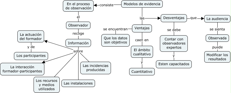 Este Cmap, tiene información relacionada con: 4.2.1.2, Ventajas caen en El ámbito cualitativo, Modelos de evidencia las Ventajas, La actuación del formador y de Los participantes, Ventajas se encuentran Que los datos son objetivos, Observada puede Modificar los resultados, Observador recoge Información, Información sobre Los recursos y medios utilizados, En el proceso de observación el Observador, La audiencia se sienta Observada, Información sobre Las instalaciones, Información sobre Las incidencias producidas, Contar con observadores expertos y Esten capacitados, Modelos de evidencia consiste En el proceso de observación, Modelos de evidencia las Desventajas, Desventajas que La audiencia, Desventajas se debe Contar con observadores expertos, Información sobre La actuación del formador, Información sobre La interacción formador-participantes, El ámbito cualitativo y Cuantitativo