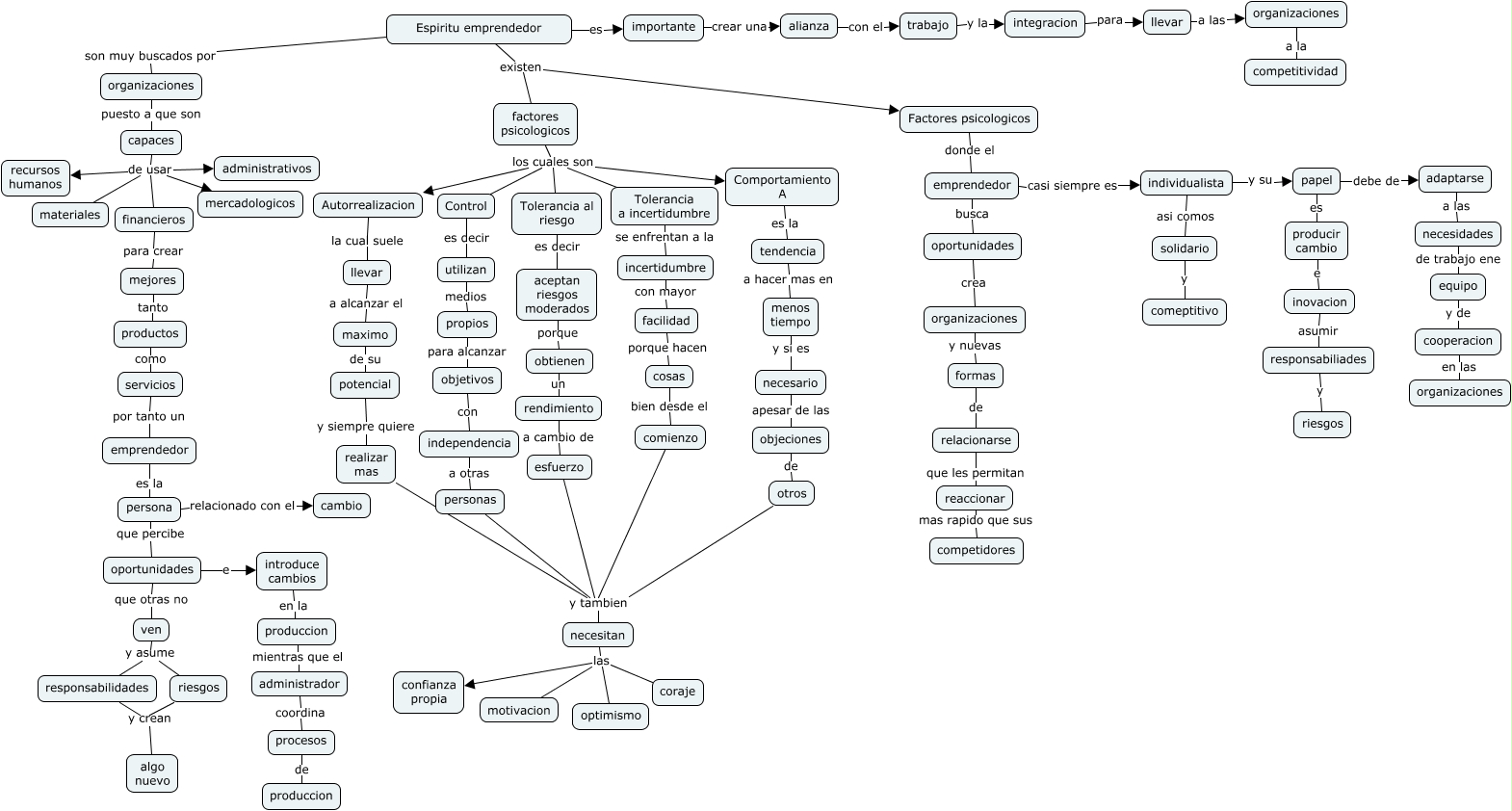 Este Cmap, tiene información relacionada con: ESPIRITU EMPRENDEDOR, maximo de su potencial, oportunidades que otras no ven, riesgos y crean algo nuevo, esfuerzo y tambien necesitan, persona relacionado con el cambio, tendencia a hacer mas en menos tiempo, factores psicologicos los cuales son Control, responsabiliades y riesgos, llevar a alcanzar el maximo, Tolerancia a incertidumbre se enfrentan a la incertidumbre, rendimiento a cambio de esfuerzo, emprendedor es la persona, individualista y su papel, servicios por tanto un emprendedor, productos como servicios, capaces de usar recursos humanos, alianza con el trabajo, importante crear una alianza, otros y tambien necesitan, necesario apesar de las objeciones