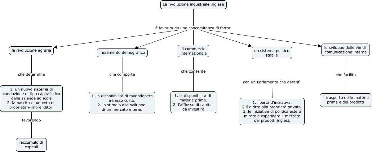 Questa Cmap, creata con IHMC CmapTools, contiene informazioni relative a: Rivoluzione industriale, La rivoluzione industriale inglese è favorita da una concomitanza di fattori lo sviluppo delle vie di comunicazione interne, La rivoluzione industriale inglese è favorita da una concomitanza di fattori un sistema politico stabile, La rivoluzione industriale inglese è favorita da una concomitanza di fattori la rivoluzione agraria, il commercio internazionale che consente 1. la disponibilità di materie prime. 2. l'afflusso di capitali da investire, la rivoluzione agraria che determina 1. un nuovo sistema di conduzione di tipo capitalistico delle aziende agricole 2. la nascita di un ceto di proprietari-imprenditori, 1. un nuovo sistema di conduzione di tipo capitalistico delle aziende agricole 2. la nascita di un ceto di proprietari-imprenditori favorendo l'accumulo di capitali, lo sviluppo delle vie di comunicazione interne che facilita il trasporto delle materie prime e dei prodotti, un sistema politico stabile con un Parlamento che garantì 1. libertà d'iniziativa. 2 il diritto alla proprietà privata. 3. le iniziative di politica estera mirate a espandere il mercato dei prodotti inglesi., La rivoluzione industriale inglese è favorita da una concomitanza di fattori incremento demografico, La rivoluzione industriale inglese è favorita da una concomitanza di fattori il commercio internazionale, incremento demografico che comporta 1. la disponibilità di manodopera a basso costo. 2. lo stimolo allo sviluppo di un mercato interno