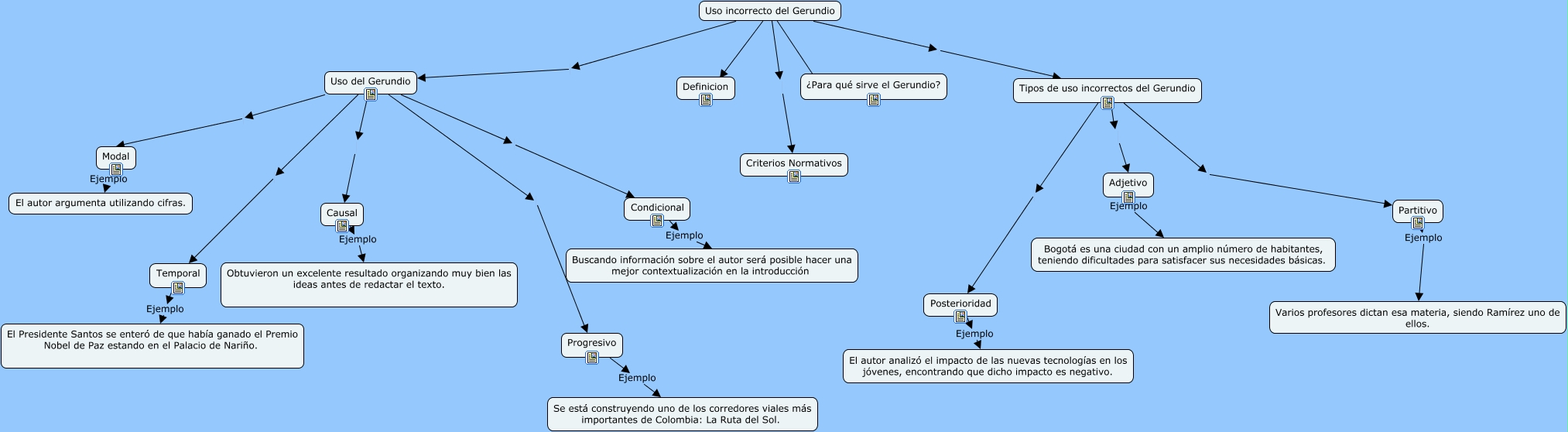 Este Cmap, tiene información relacionada con: Uso incorrecto del Gerundio, Uso del Gerundio Causal, Posterioridad Ejemplo El autor analizó el impacto de las nuevas tecnologías en los jóvenes, encontrando que dicho impacto es negativo., Uso incorrecto del Gerundio ¿Para qué sirve el Gerundio?, Uso incorrecto del Gerundio Uso del Gerundio, Temporal Ejemplo El Presidente Santos se enteró de que había ganado el Premio Nobel de Paz estando en el Palacio de Nariño., Partitivo Ejemplo Varios profesores dictan esa materia, siendo Ramírez uno de ellos., Uso del Gerundio Condicional, Uso incorrecto del Gerundio Tipos de uso incorrectos del Gerundio, Tipos de uso incorrectos del Gerundio Posterioridad, Condicional Ejemplo Buscando información sobre el autor será posible hacer una mejor contextualización en la introducción, Modal Ejemplo El autor argumenta utilizando cifras., Progresivo Ejemplo Se está construyendo uno de los corredores viales más importantes de Colombia: La Ruta del Sol., Causal Ejemplo Obtuvieron un excelente resultado organizando muy bien las ideas antes de redactar el texto., Tipos de uso incorrectos del Gerundio Partitivo, Tipos de uso incorrectos del Gerundio Adjetivo, Uso del Gerundio Temporal, Uso incorrecto del Gerundio Definicion, Uso del Gerundio Modal, Uso incorrecto del Gerundio Criterios Normativos, Uso del Gerundio Progresivo