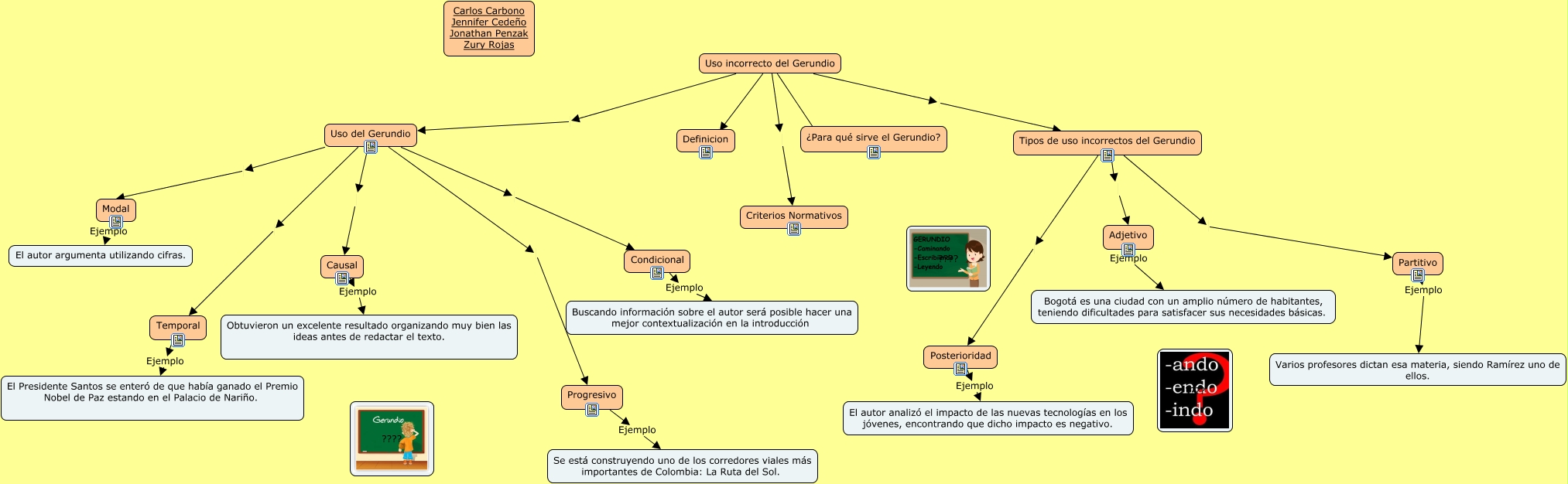 Este Cmap, tiene información relacionada con: Uso incorrecto del Gerundio.cmap, Uso del Gerundio Causal, Posterioridad Ejemplo El autor analizó el impacto de las nuevas tecnologías en los jóvenes, encontrando que dicho impacto es negativo., Uso incorrecto del Gerundio ¿Para qué sirve el Gerundio?, Uso incorrecto del Gerundio Uso del Gerundio, Temporal Ejemplo El Presidente Santos se enteró de que había ganado el Premio Nobel de Paz estando en el Palacio de Nariño., Partitivo Ejemplo Varios profesores dictan esa materia, siendo Ramírez uno de ellos., Uso del Gerundio Condicional, Uso incorrecto del Gerundio Tipos de uso incorrectos del Gerundio, Tipos de uso incorrectos del Gerundio Posterioridad, Condicional Ejemplo Buscando información sobre el autor será posible hacer una mejor contextualización en la introducción, Modal Ejemplo El autor argumenta utilizando cifras., Progresivo Ejemplo Se está construyendo uno de los corredores viales más importantes de Colombia: La Ruta del Sol., Causal Ejemplo Obtuvieron un excelente resultado organizando muy bien las ideas antes de redactar el texto., Tipos de uso incorrectos del Gerundio Partitivo, Tipos de uso incorrectos del Gerundio Adjetivo, Uso del Gerundio Temporal, Uso incorrecto del Gerundio Definicion, Uso del Gerundio Modal, Uso incorrecto del Gerundio Criterios Normativos, Uso del Gerundio Progresivo