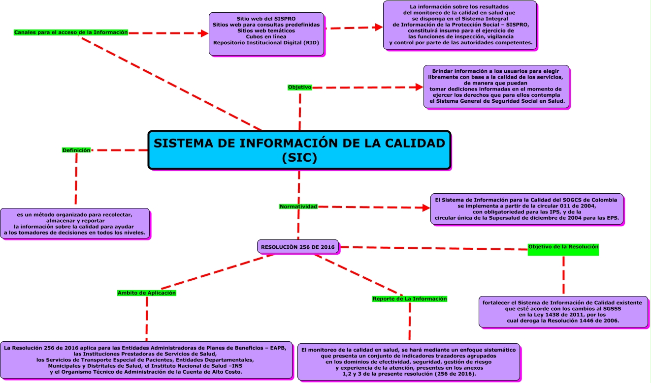 Este Cmap, tiene información relacionada con: SIC, RESOLUCIÓN 256 DE 2016 Reporte de La Información El monitoreo de la calidad en salud, se hará mediante un enfoque sistemático que presenta un conjunto de indicadores trazadores agrupados en los dominios de efectividad, seguridad, gestión de riesgo y experiencia de la atención, presentes en los anexos 1,2 y 3 de la presente resolución (256 de 2016)., SISTEMA DE INFORMACIÓN DE LA CALIDAD (SIC) Normatividad RESOLUCIÓN 256 DE 2016, RESOLUCIÓN 256 DE 2016 Objetivo de la Resolución fortalecer el Sistema de Información de Calidad existente que esté acorde con los cambios al SGSSS en la Ley 1438 de 2011, por los cual deroga la Resolución 1446 de 2006., SISTEMA DE INFORMACIÓN DE LA CALIDAD (SIC) Canales para el acceso de la Información Sitio web del SISPRO Sitios web para consultas predefinidas Sitios web temáticos Cubos en línea Repositorio Institucional Digital (RID), SISTEMA DE INFORMACIÓN DE LA CALIDAD (SIC) Definición es un método organizado para recolectar, almacenar y reportar la información sobre la calidad para ayudar a los tomadores de decisiones en todos los niveles., RESOLUCIÓN 256 DE 2016 Ambito de Aplicación La Resolución 256 de 2016 aplica para las Entidades Administradoras de Planes de Beneficios – EAPB, las Instituciones Prestadoras de Servicios de Salud, los Servicios de Transporte Especial de Pacientes, Entidades Departamentales, Municipales y Distritales de Salud, el Instituto Nacional de Salud –INS y el Organismo Técnico de Administración de la Cuenta de Alto Costo., Sitio web del SISPRO Sitios web para consultas predefinidas Sitios web temáticos Cubos en línea Repositorio Institucional Digital (RID) ???? La información sobre los resultados del monitoreo de la calidad en salud que se disponga en el Sistema Integral de Información de la Protección Social – SISPRO, constituirá insumo para el ejercicio de las funciones de inspección, vigilancia y control por parte de las autoridades competentes., SISTEMA DE INFORMACIÓN DE LA CALIDAD (SIC) Normatividad El Sistema de Información para la Calidad del SOGCS de Colombia se implementa a partir de la circular 011 de 2004, con obligatoriedad para las IPS, y de la circular única de la Supersalud de diciembre de 2004 para las EPS., SISTEMA DE INFORMACIÓN DE LA CALIDAD (SIC) Objetivo Brindar información a los usuarios para elegir libremente con base a la calidad de los servicios, de manera que puedan tomar dediciones informadas en el momento de ejercer los derechos que para ellos contempla el Sistema General de Seguridad Social en Salud.